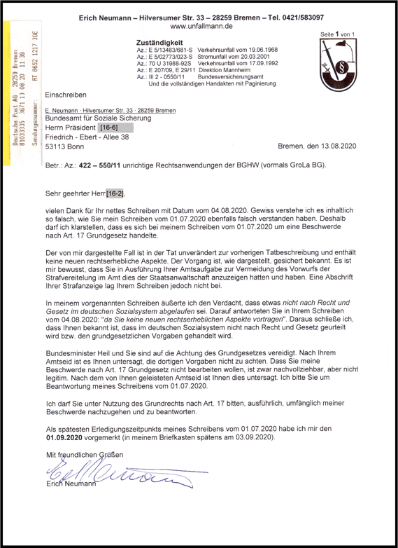 Mit meinem Schreiben vom 24.08.2020 habe ich vorgetragen, dass die weitere Aufklärung erfolgen muss. Ansonsten wäre auch das Bundesamt für Soziale Sicherung angreifbar.