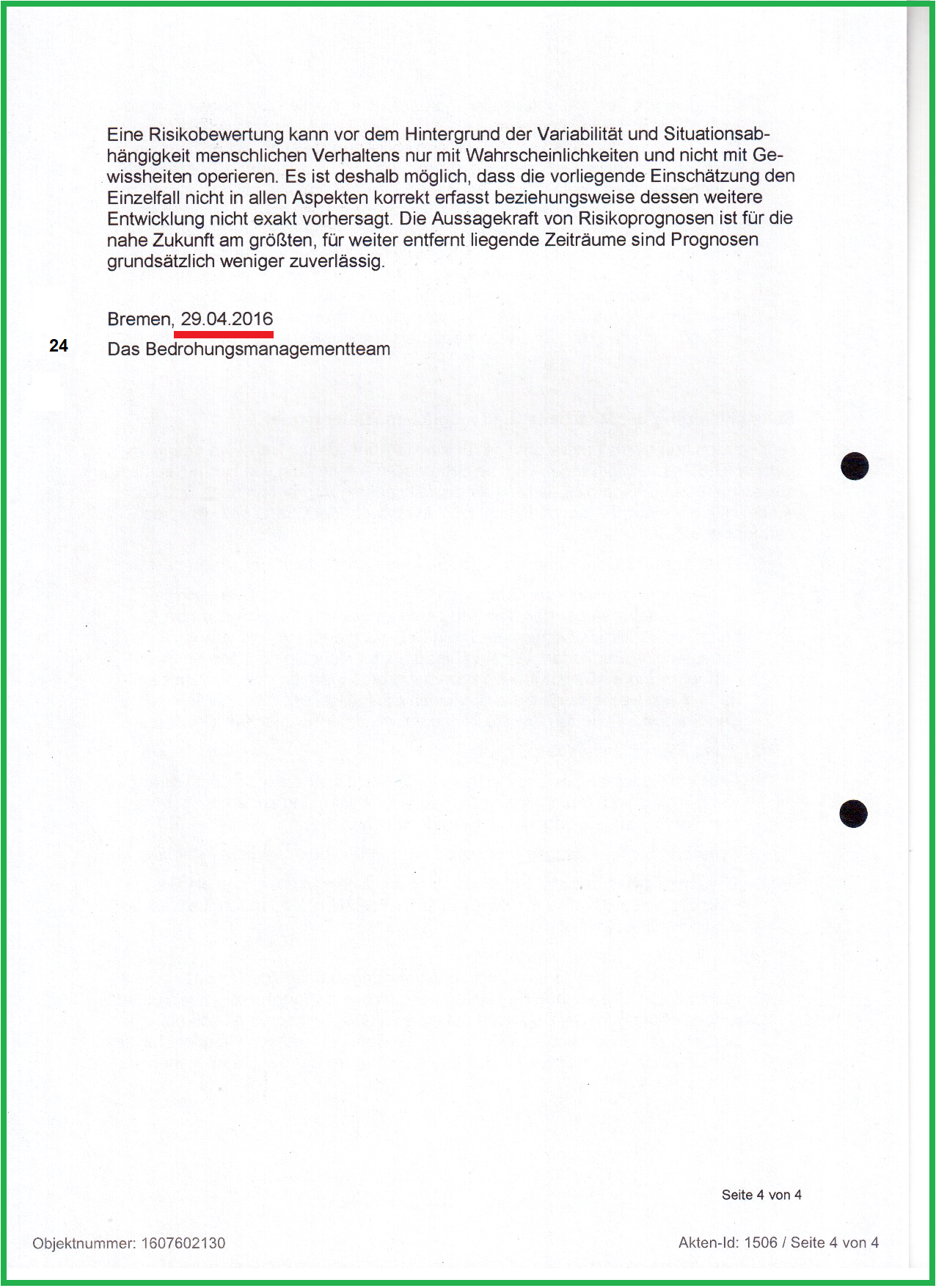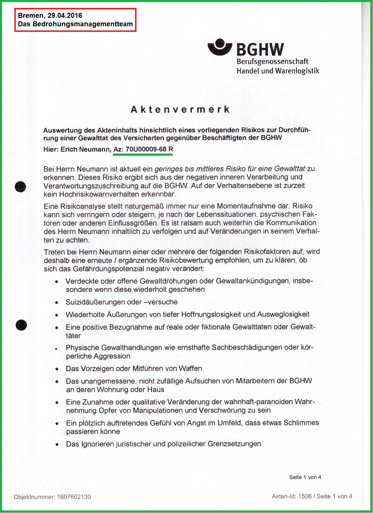 Mit einem Aktenvermerk hat das Bedrohungsmanagementteam der BGHW am 29.04.2016 nachvollziehbar dokumentiert, mit Bumerangsätzen können die Aktenbearbeiter die Aufklärung verhindern.