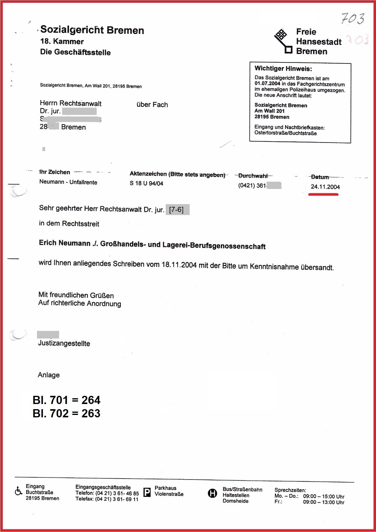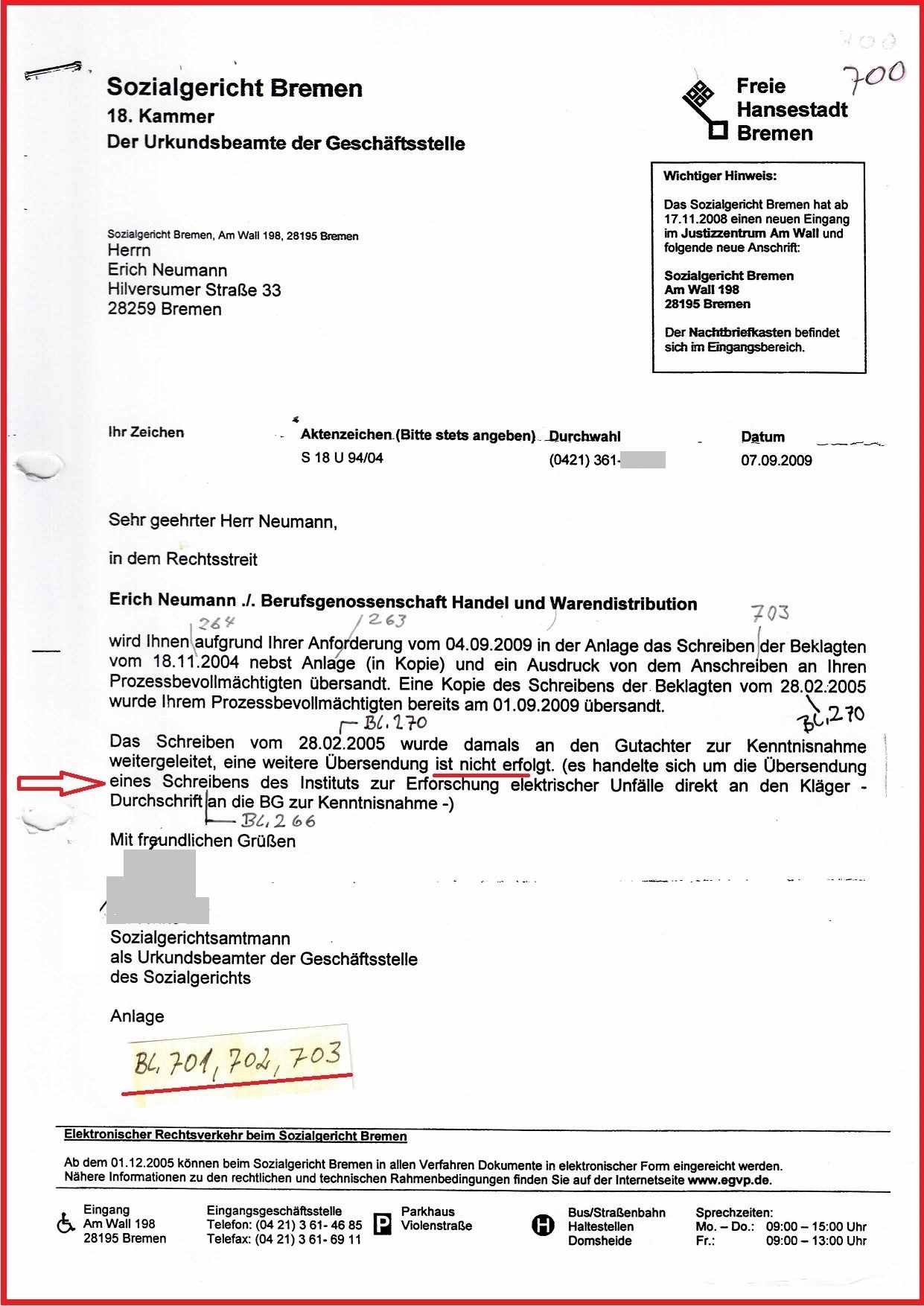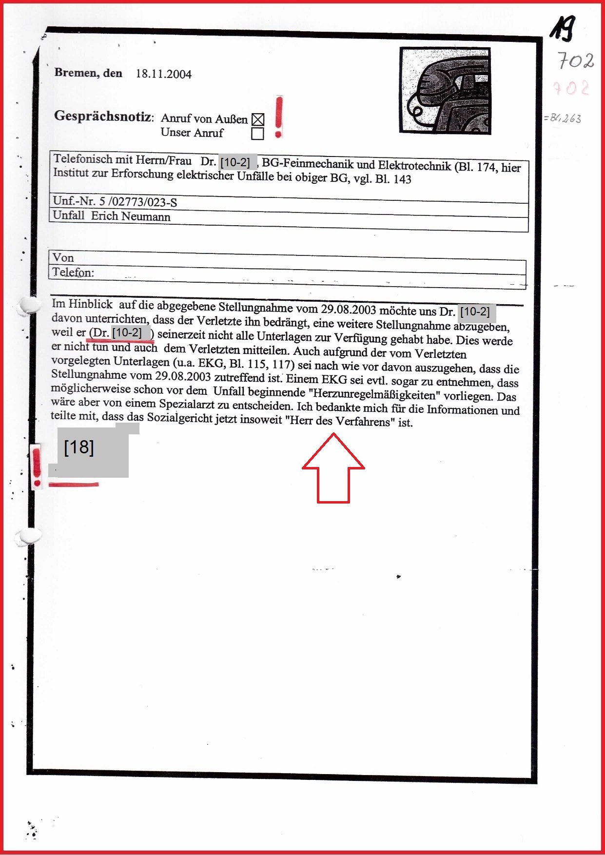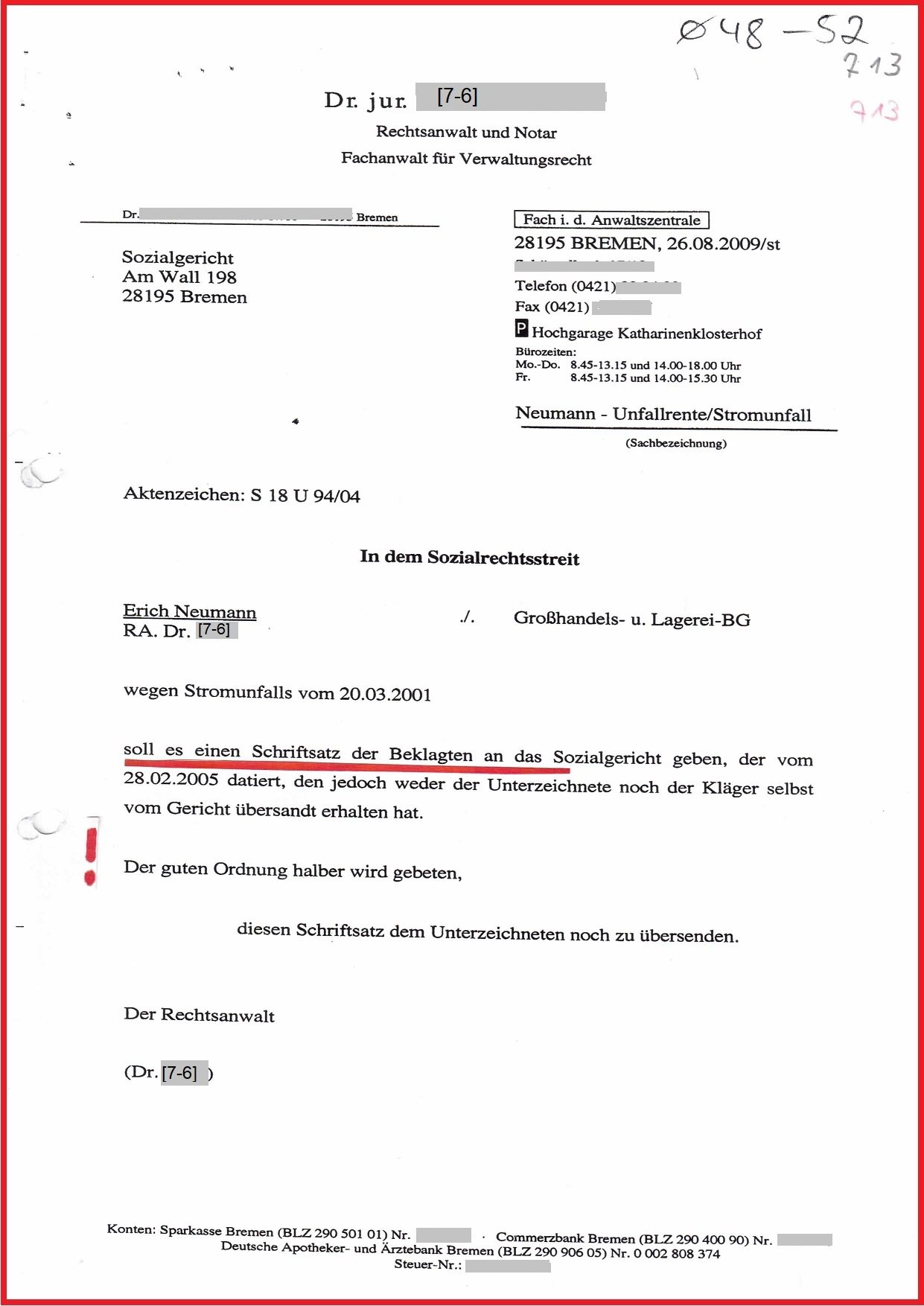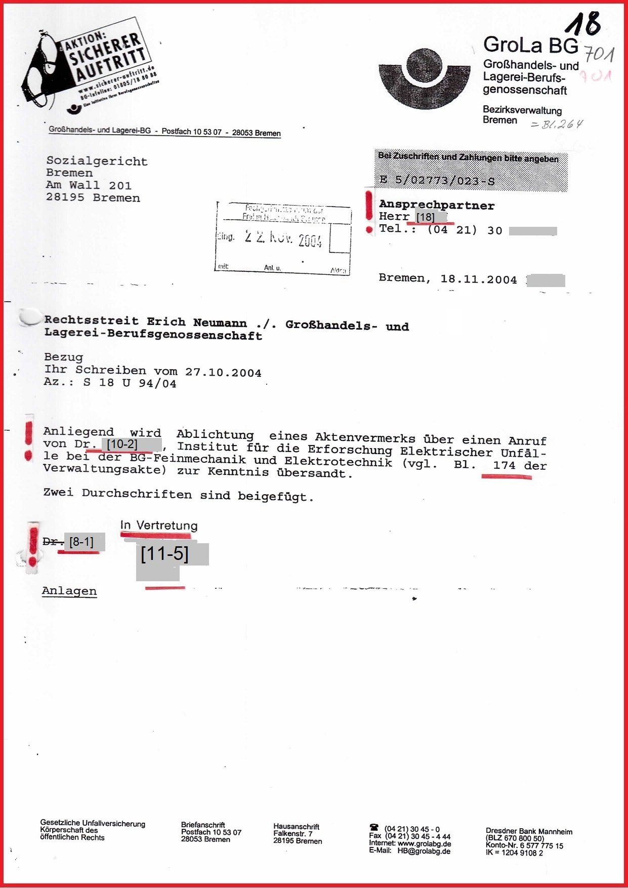 Seit dem Schreiben der Datenschutzbeauftragten Bremen vom 10.03.2020 ist ungelöst, warum die Gerichtsakte am Sozialgericht (SG) Bremen Az.: S 18 U 94/04 nicht mehr auffindbar ist und Prozessdelikt dokumentiert. Und warum ist die interne Stellungnahme der BGHW Bremen, gerichtet an die Direktion Mannheim vom 05.10.2009 zu meinem Beschwerdeverfahren Az.: E 207/09 nicht mehr auffindbar und auf drei Seiten u. a. dokumentiert: