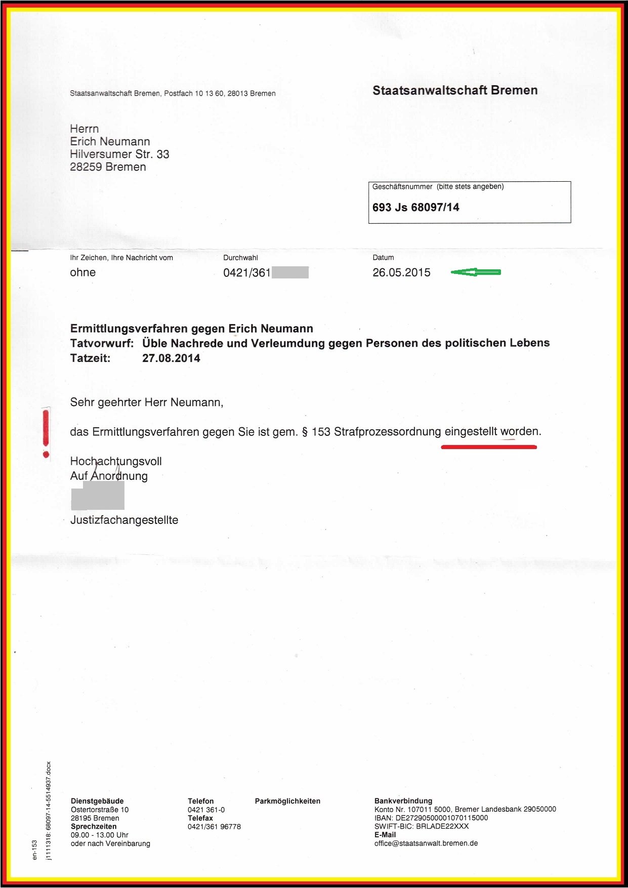 So ist es mit dem Schreiben der Staatsanwaltschaft Bremen vom 27.03.2012 nachvollziehbar dokumentiert (Az.: 694 Js 16567/12).