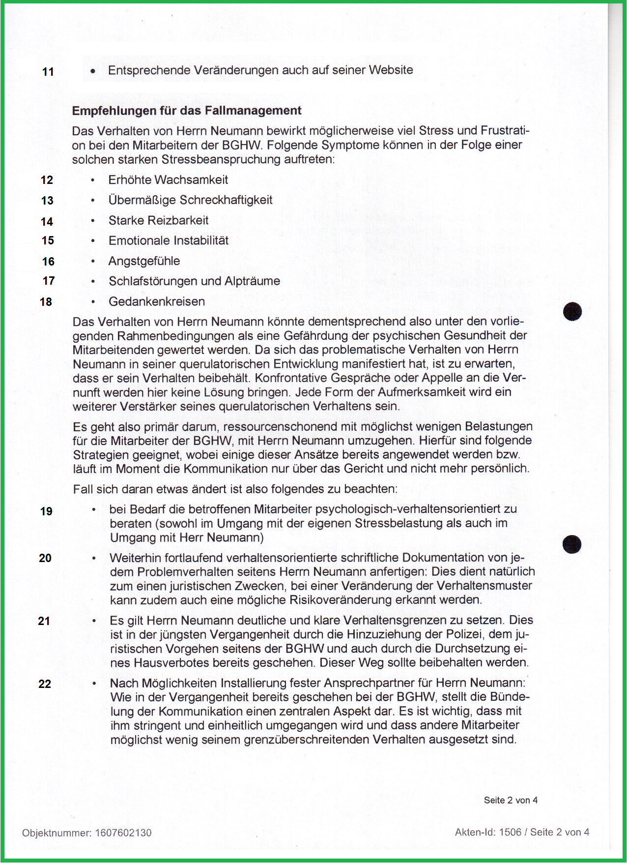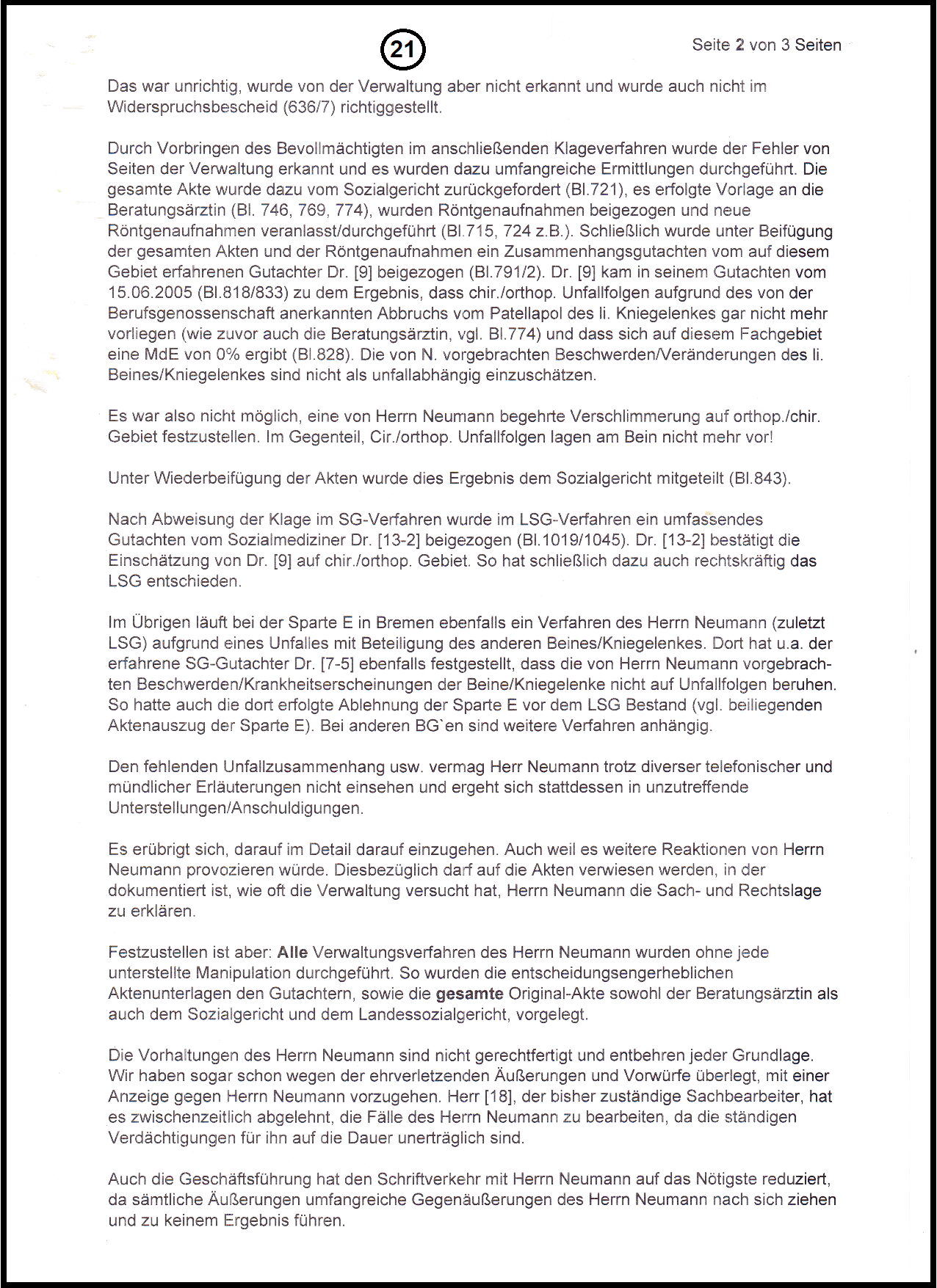 "Die Geschäftsführung der BGHW in Bremen will sich nicht in die unzutreffenden Anschuldigungen/Detailbeschreibungen des Verletzten verlieren. Dass man sich nun völlig zurückzieht, ist nicht zu raten, da man sich dann der Gefahr einer möglichen Untätigkeitsklage aussetzt. Auch wollen wir nicht angreifbar sein, wenn die Auseinandersetzungen mit Herrn Neumann weiter eskalieren sollten. Ferner bleibt Herr Neumann in jeder Form unberechenbar, wenn er feststellt, dass nichts weiter passieren sollte.