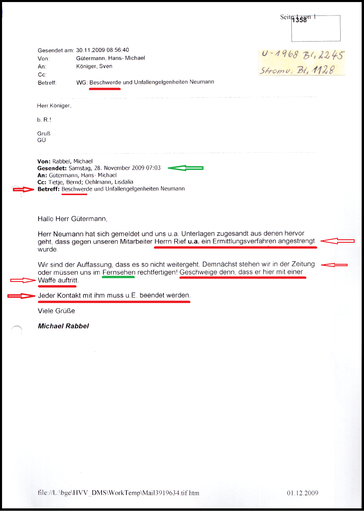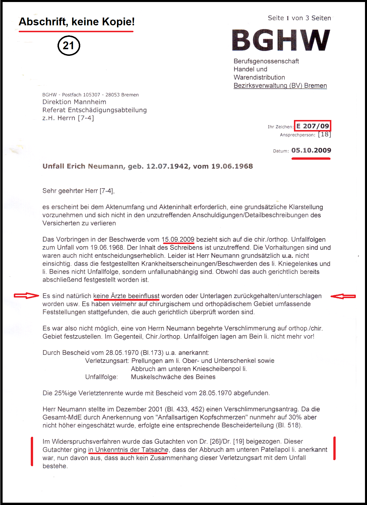 In der Direktion der BGHW-Mannheim habe ich mit meinem Schreiben vom 15.09.2009 mein Beschwerdeverfahren (Az.: E 207/09) ausgelöst. Dazu hat die aktenführende BGHW-Bremen eine interne Stellungnahme vom 05.10.2009 angefertigt und der BGHW-Mannheim übersandt. U.a. mit dem Hinweis: