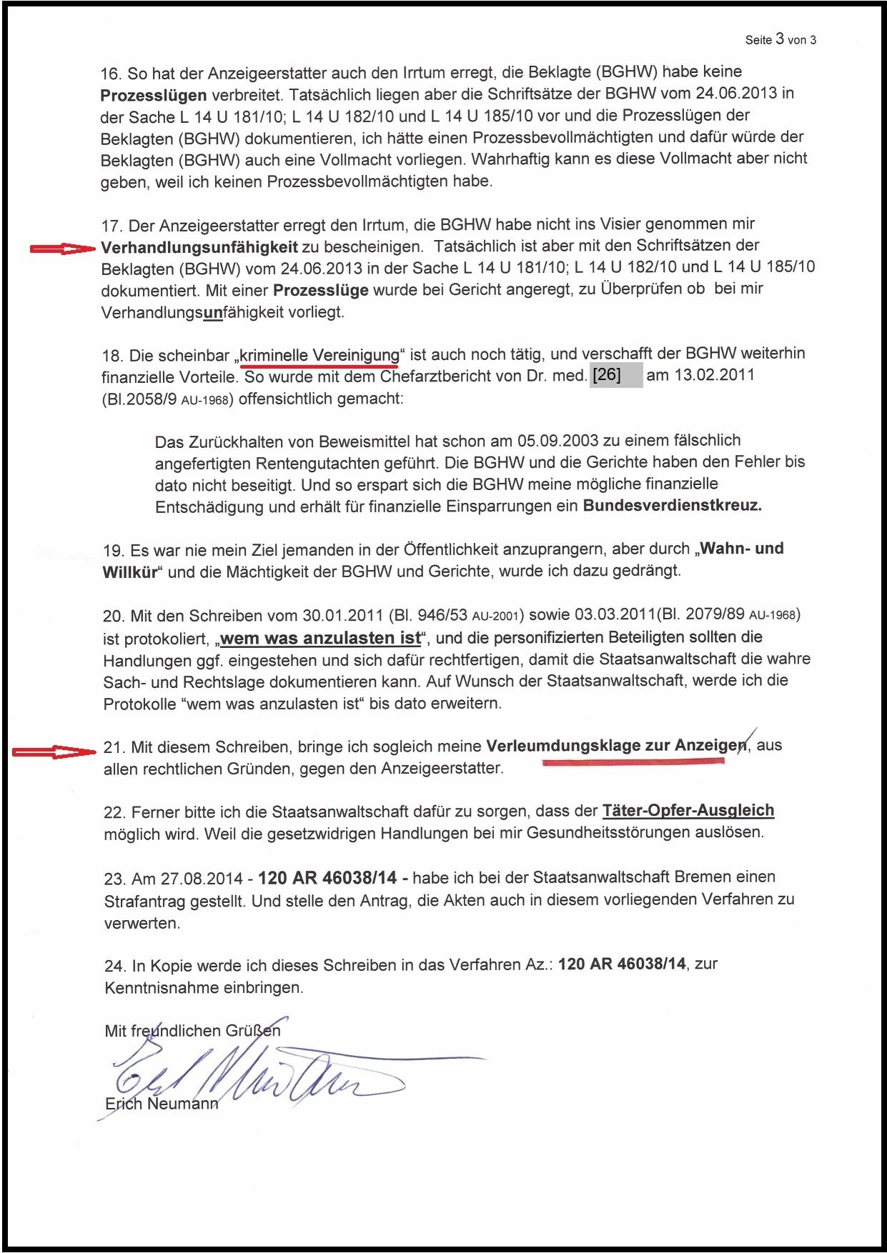 Strafanzeige der BGHW vom 02.09.2014 gegen meine Person und dem Tatvorwurf: Üble Nachrede und Verleumdung. Die Ermittlungen hat die STA Bremen nach meiner schriftlichen Aussage vom 08.02.2015 mit dem Schreiben vom 26.05.2015 sofort eingestellt. Ich bin nicht angreifbar, nun waren die höchsten Amtsträger als "kriminelle Vereinigung" personifiziert.