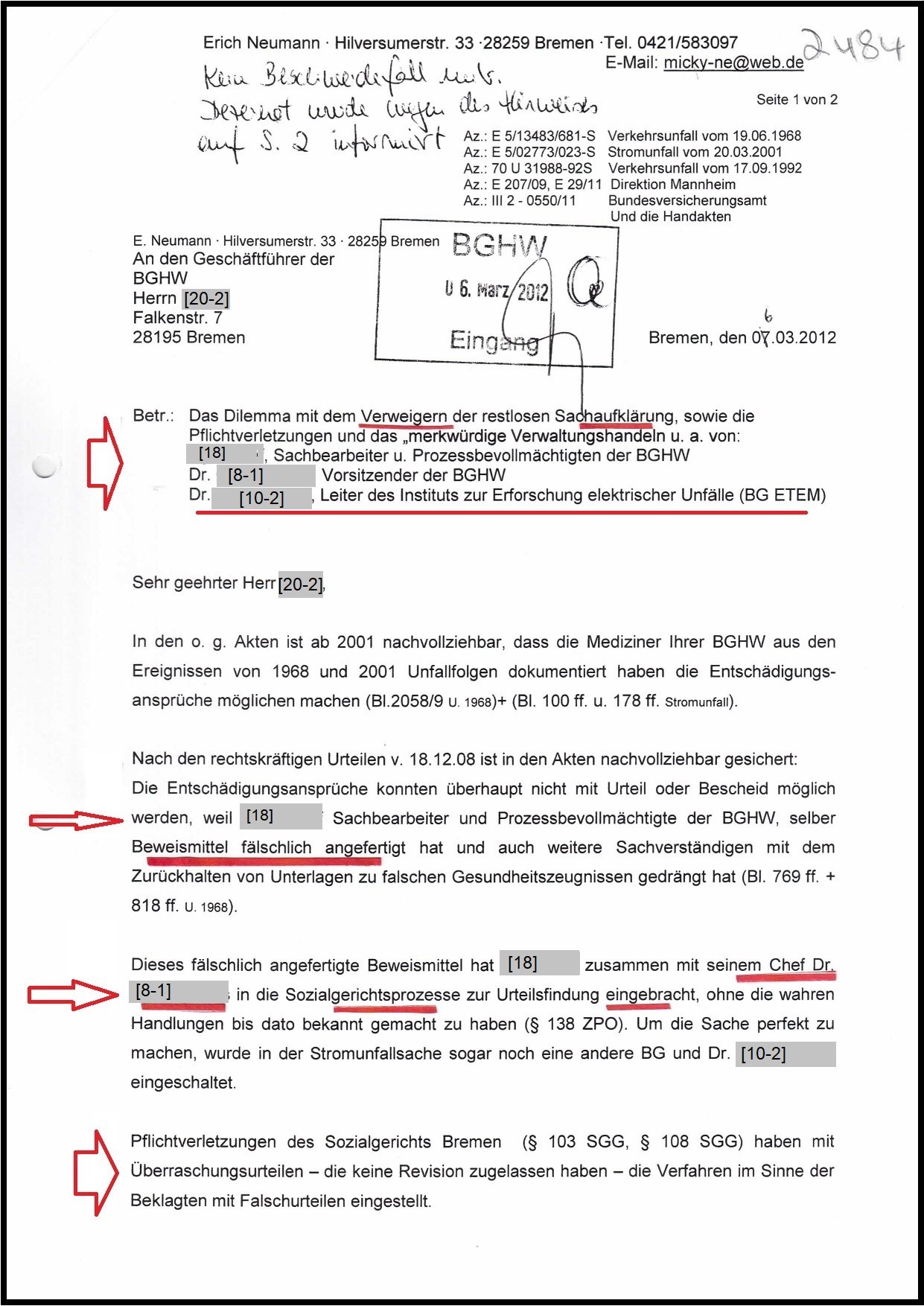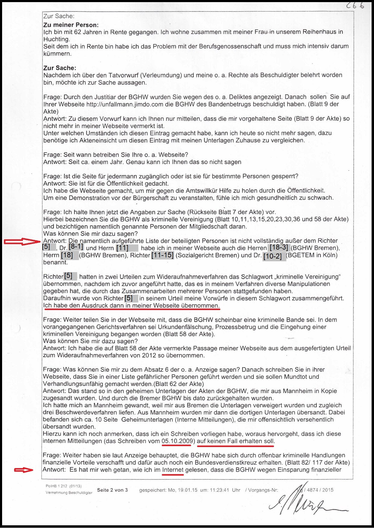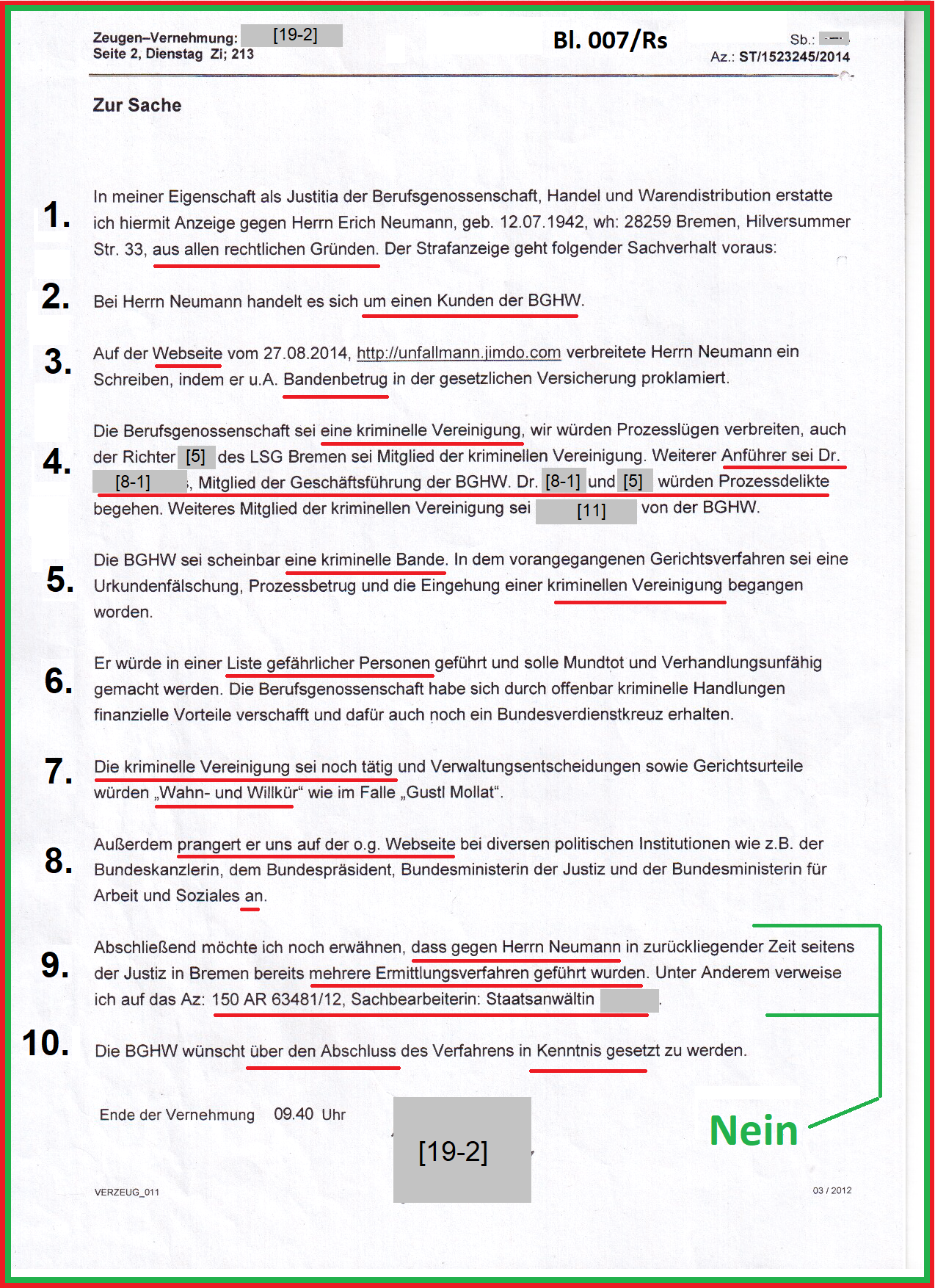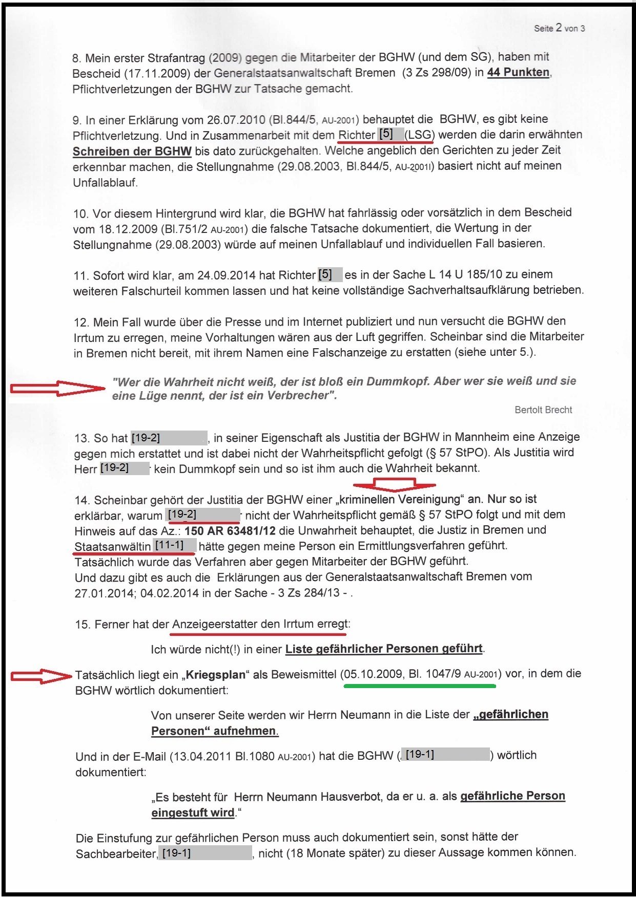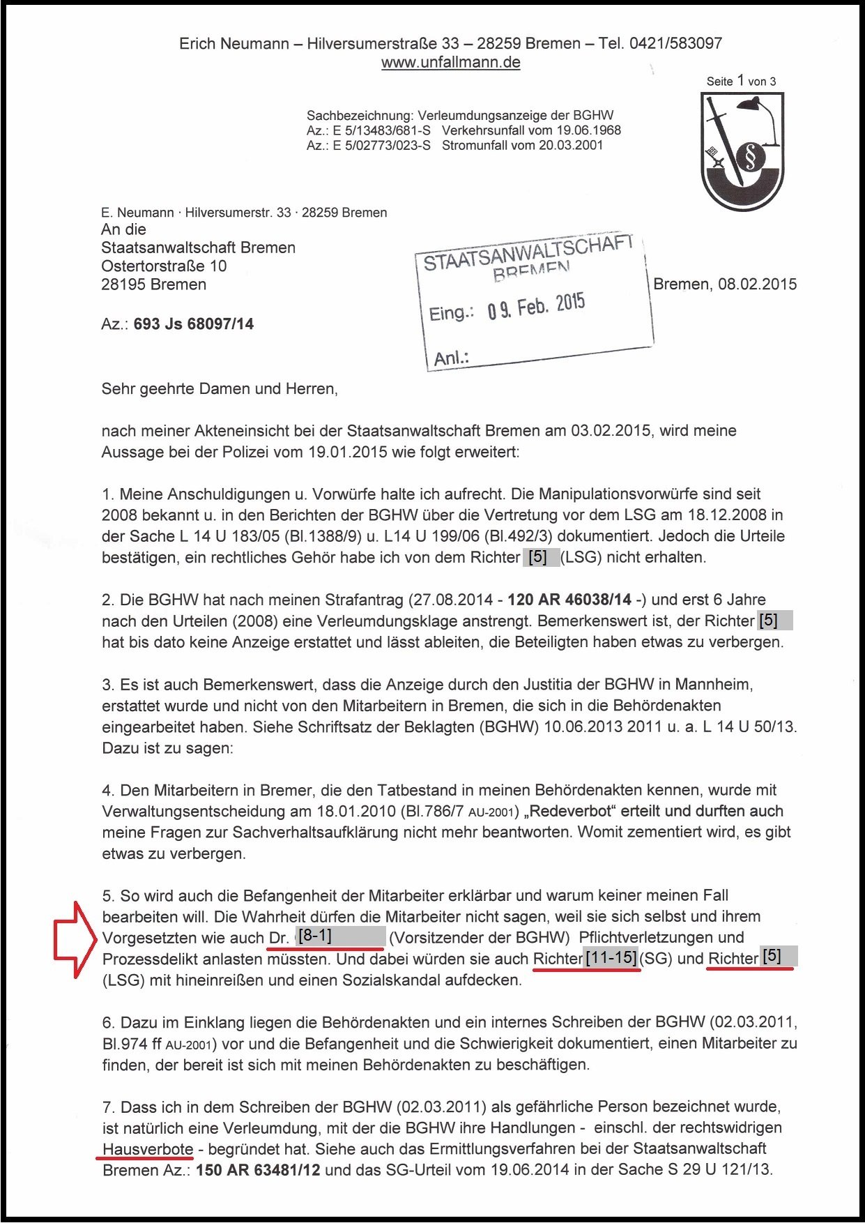 Mit dem Hinweis auf meine Webseite hat die BGHW meine Person am 02.09.2014 mit einer Verleumdungsklage angegriffen. Die Ermittlungen hat die Staatsanwaltschaft (STA) Bremen, nach meiner schriftlichen Aussage vom 08.02.2015 mit dem Schreiben vom 26.05.2015 eingestellt. Dabei hat die BGHW sogleich die Beteiligten personifiziert.