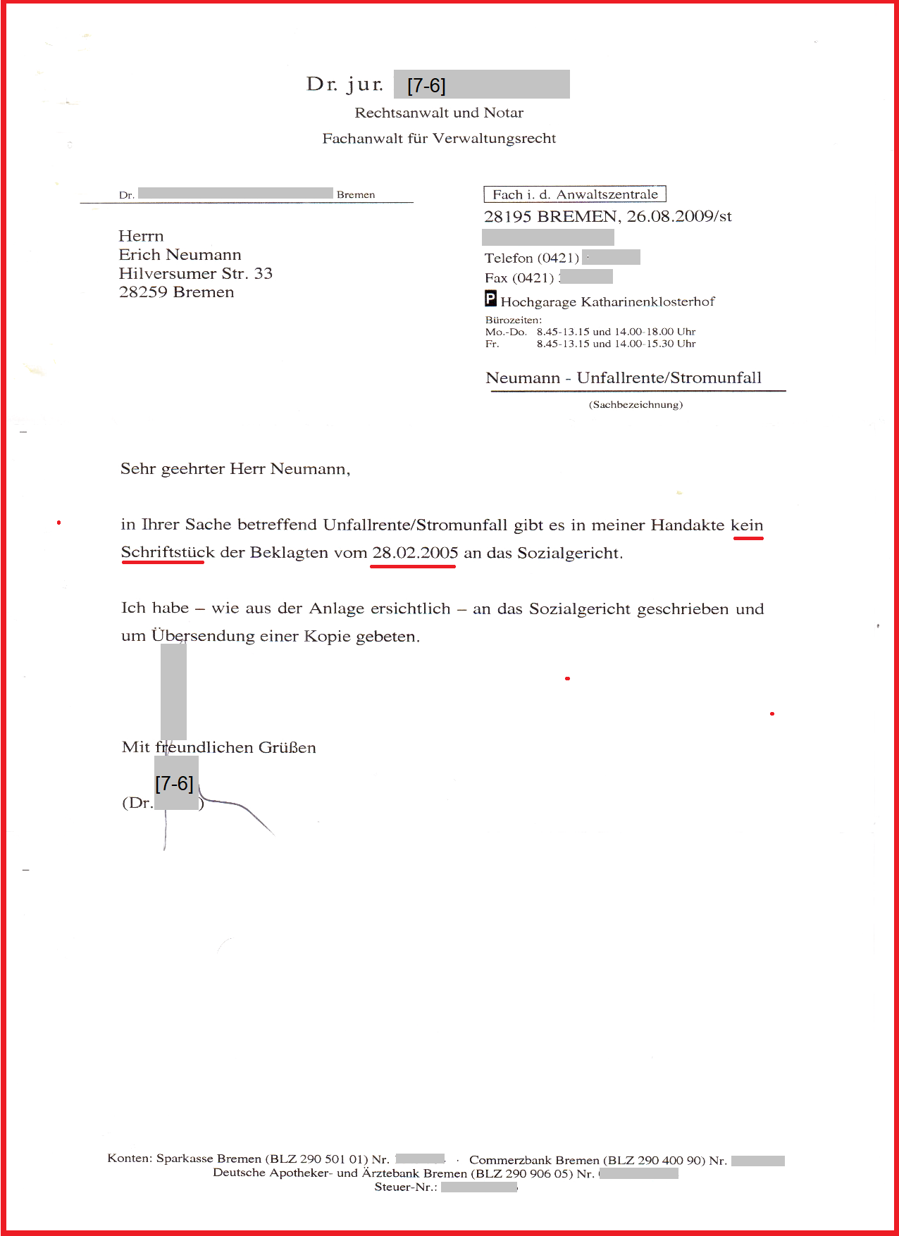 Jedoch hat die BGHW den ermittelten Gesundheitsschaden in keinem Bescheid eingetragen. Im damals laufenden Gerichtsprozess (Az.: S 18 U 94/04; L 14 U 199/06) ist mit meinem Schreiben vom 19.06.2007 dem LSG Bremen und der Beklagten das Angebot zur Amtshilfe von dem Mediziner Herrn Dr. med. [26-1] bei der BG ETEM bekannt geworden. Denn es wurde erkannt, dass das SG/LSG Bremen und die Beklagte wenig Erfahrung mit Stromunfällen haben. Die Amtshilfe wurde aber nicht angenommen. Es ist der Ansatzpunkt, eine "kriminelle Vereinigung" will sich an meiner möglichen Unfallrente bereichern und hält sich dumm.