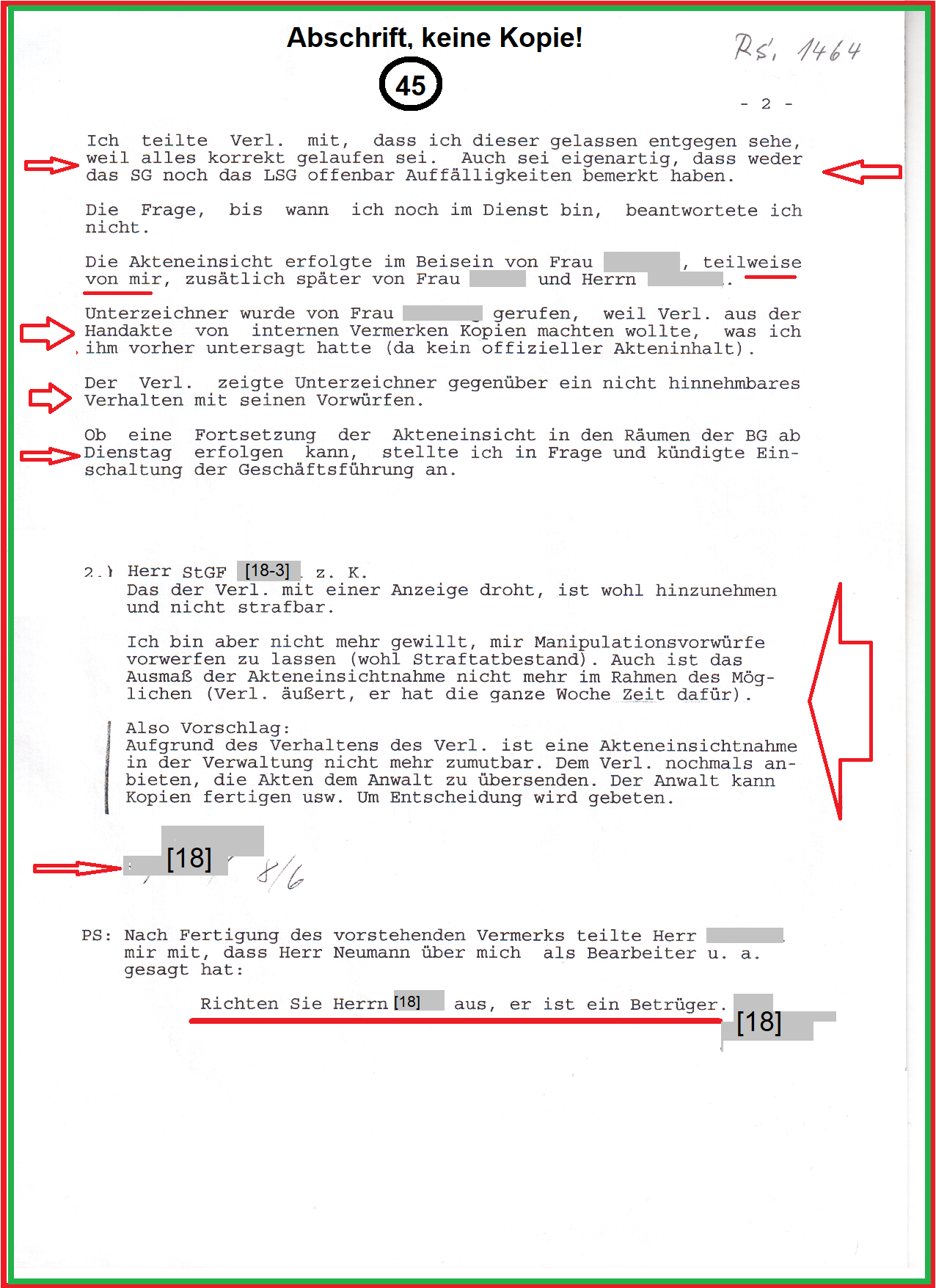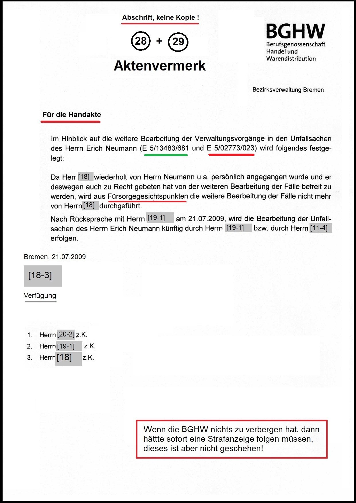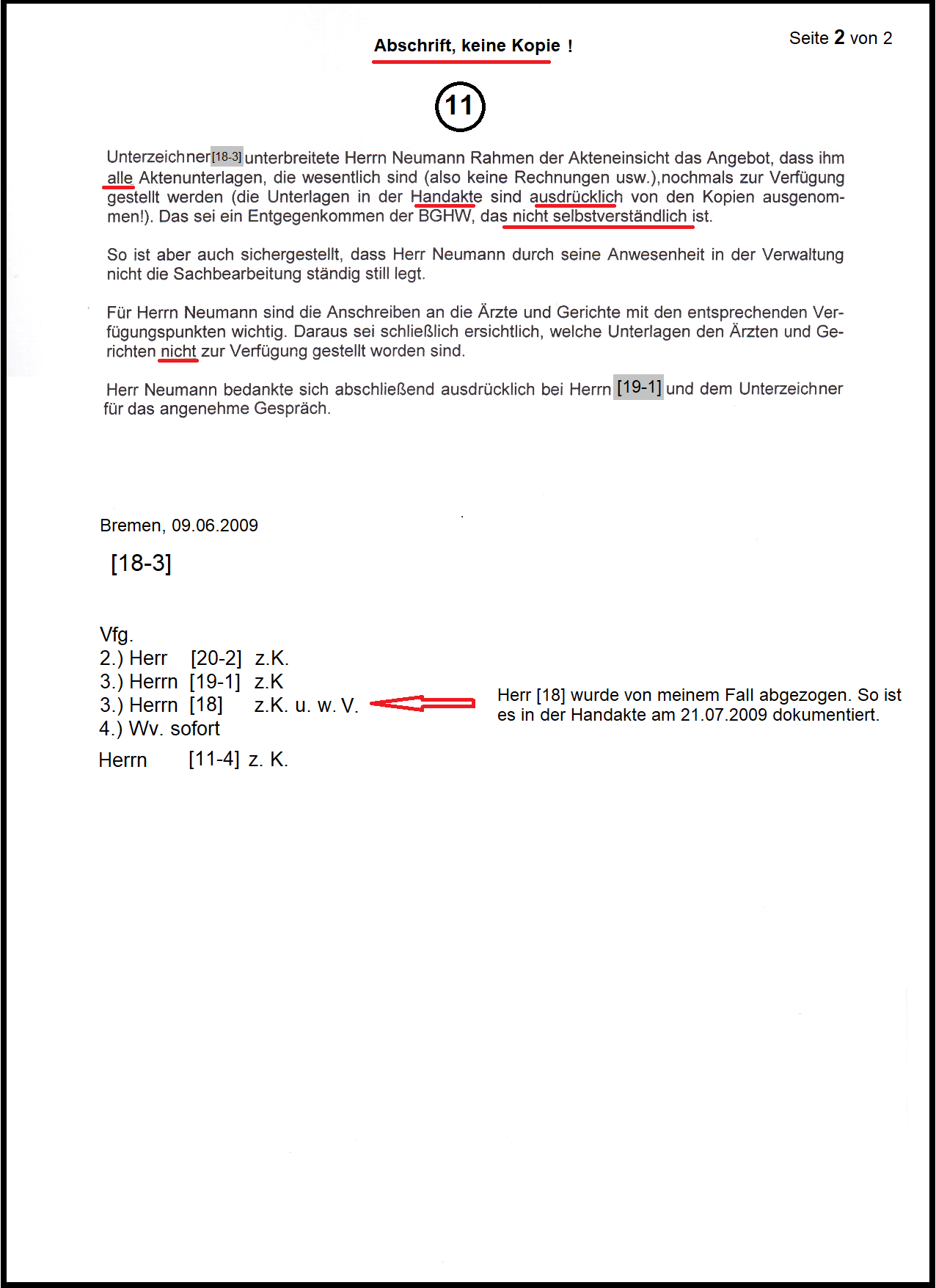 Meinem Aktenbearbeiter und Prozessbevollmächtigte der BGHW Herr [18] hat mir die Rest-Handakte bei meiner letzten Akteneinsicht am 08.06.2009 in der Behörde vorgelegt, obwohl es ihm von der Geschäftsführung mit einer Verfügung untersagt wurde. Und meinte, bei einem Verfahren persönlich ein besseres Gewissen zu haben, wenn alles vorgelegt wurde. Jedoch das Kopieren der Rest-Handakte wurde mir von Herrn [18] untersagt. Damit wurde erkannt, Herr [18] folgt nicht mehr der Geschäftsführung und wurde sofort von meinem Fall abgezogen. So hat es die Geschäftsführung mit dem Aktenvermerk vom 21.07.2009 in der Handakte bestätigt. Ich habe die Staatsanwaltschaft eingeschalten, wie das Schriftstück am 09.06.2009 bestätigt. Und die Generalstaatsanwaltschaft Bremen hat in 44 Punkten Pflichtverletzungen mit Bescheid vom 17.11.2009 zur Tatsache gemacht.