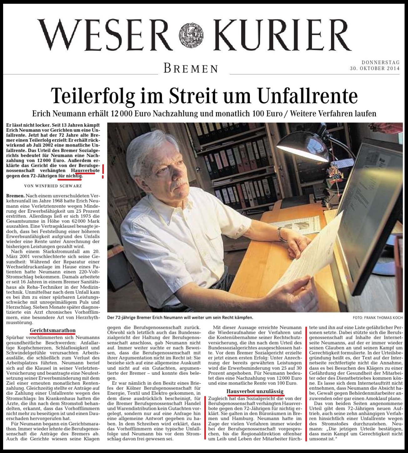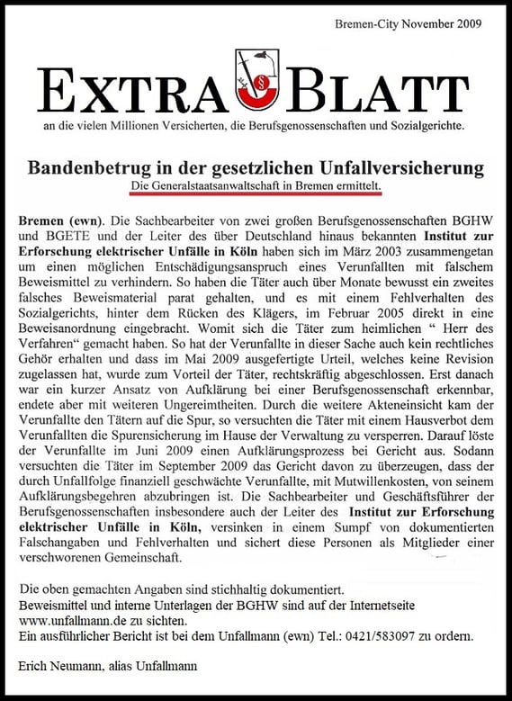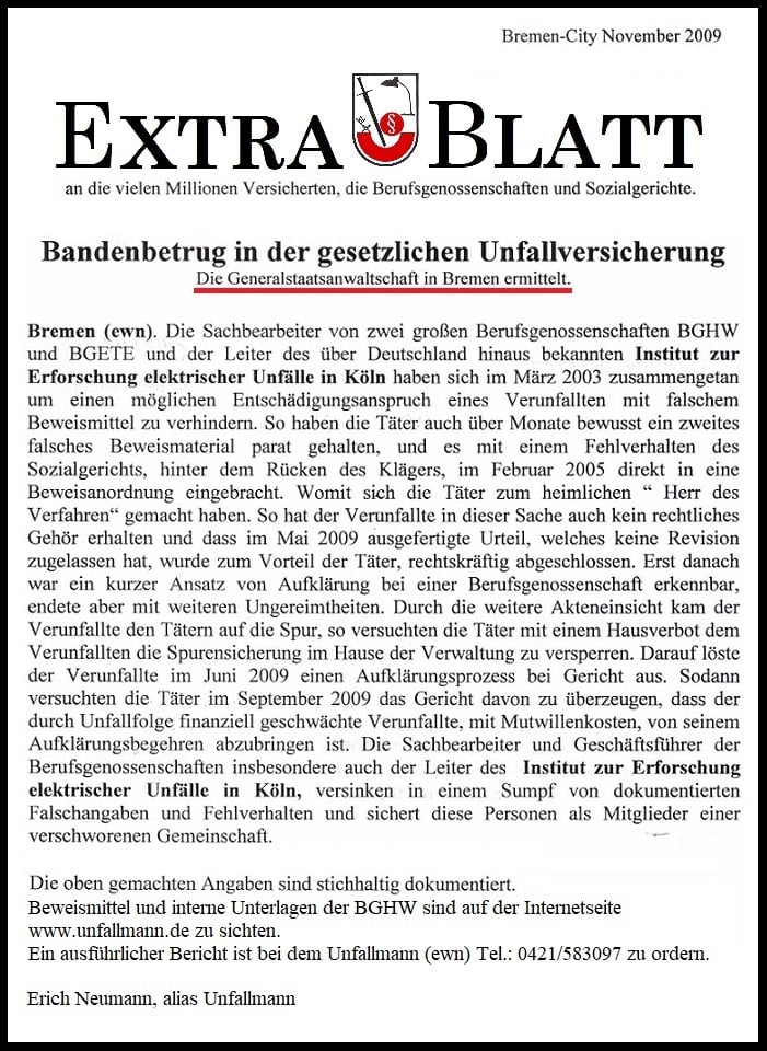 Es folgt mein offener Brief an alle Behörden in Bremen u. an den Bürgermeister Bremen Herrn Bovenschulte. Was jetzt folgt, darüber sind die Behörden in Bremen schon seit vielen Jahren Informiert, aber es passiert nichts. Dazu im Einklang liegen die Presseberichte vor. Insoweit ist auch bekannt, bei der BGHW in Bremen muss ich gegen eine "kriminelle Vereinigung" der Geschäftsführung antreten, die niemals Zurückrudern wird und vom Gesetzgeber mit einer Freiheitsstrafe bedroht wird. Behördenmitarbeiter fühlen sich bedroht und haben schon am 28.11.2009 vorgetragen: