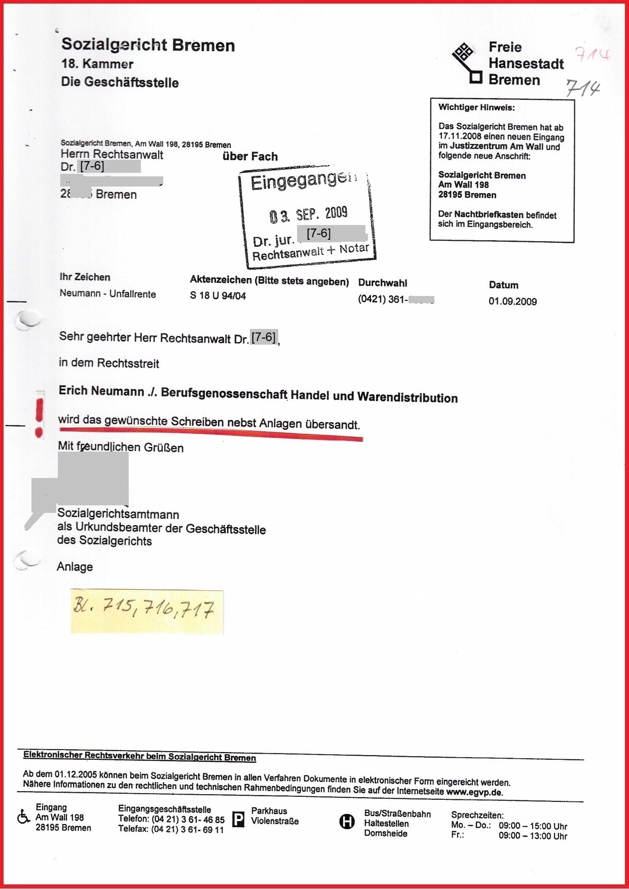 Danach konnte mein Anwalt mit dem Antwortschreiben aus dem SG Bremen vom 01.09.2008 (Bl.714) aufdecken, das SG Bremen hat Aktenmaterial zurückgehalten und kam zu der Wertung: Das SG Bremen und die Beklagte sind wegen Prozessdelikt angreifbar. Damit wollte mein Anwalt nichts zutun haben u. wünschte mir beim Weitermachen viel Glück.