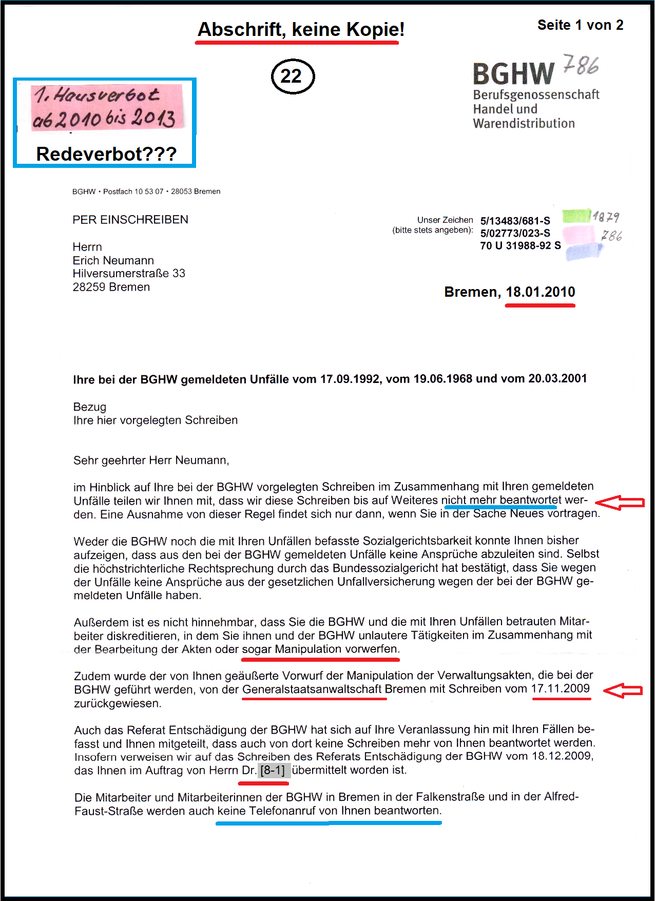 Mit der Verwaltungsentscheidung der BGHW-Bremen vom 18.01.2010 ist sogleich dokumentiert, das Syndikat hat den Bearbeitern meiner Behördenakte "Redeverbot" erteilt und ist noch am Wirken.