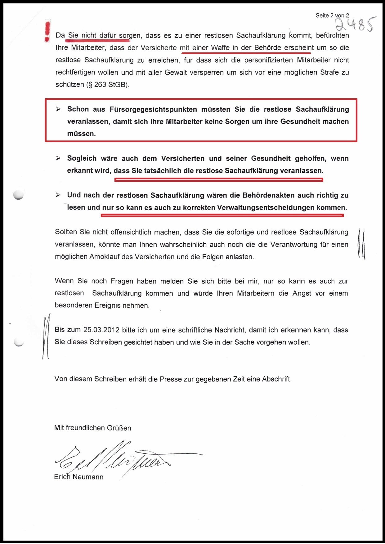 Von unserer Seite werden wir Herrn Neumann in die Liste der "gefährlichen Personen" aufnehmen und überlegen, ihm schriftlich untersagen, die Verwaltung zu betreten. Denn leider ist nicht vorhersehbar, wie Herr Neumann künftig reagiert. Um einer möglichen Gefährdung für Leib und Leben aus dem Weg zu gehen und im Hinblick auf die getätigten Aussagen, halten wir das Vorgehen auch für gerechtfertigt."