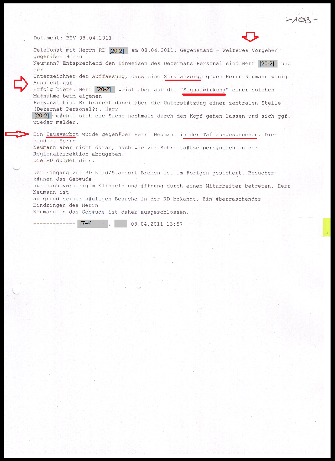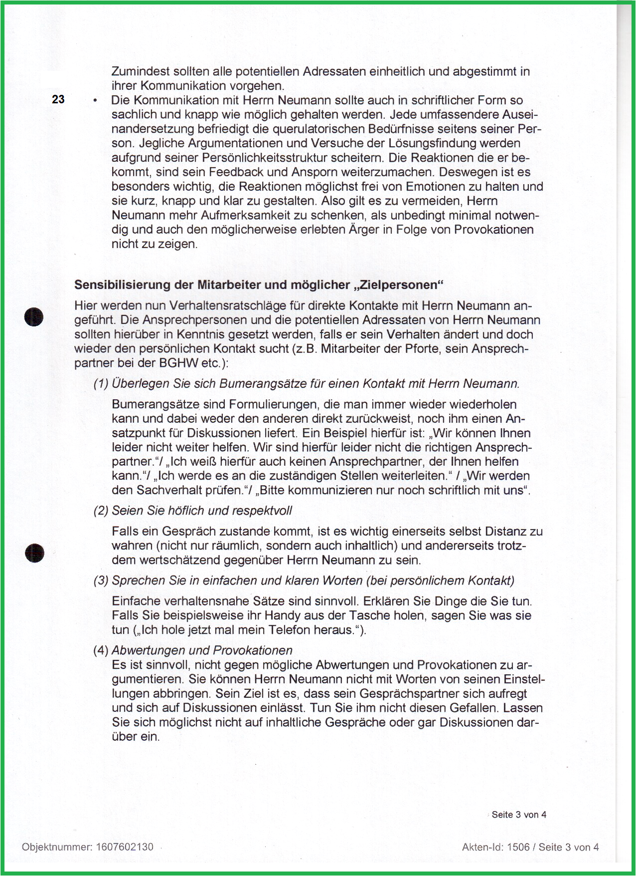 Ferner bleibt Herr Neumann in jeder Form unberechenbar, wenn er feststellt, dass nichts weiter passieren sollte. Von unserer Seite werden wir Herrn Neumann in die Liste der "gefährlichen Personen" aufnehmen und überlegen, ihm schriftlich untersagen, die Verwaltung zu betreten. Denn leider ist nicht vorhersehbar, wie Herr Neumann künftig reagiert.