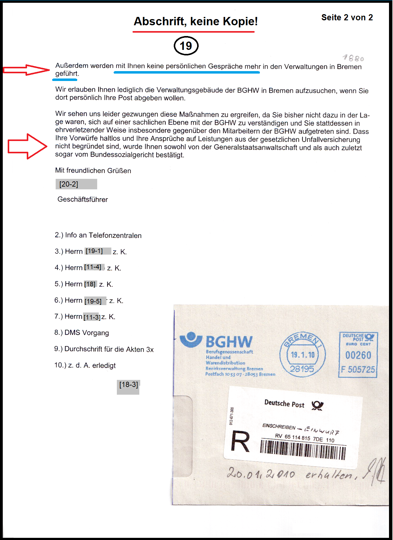 So hat es der Geschäftsführer der BGHW-Bremen am 18.01.2010 mit seiner Verwaltungsentscheidung dokumentiert. Und wurde mit der Listennummer (22) zur Geheimhaltung festgesetzt. Es kam zu einem riesigen Aktenmaterial, weil die Bearbeiter meiner Akte auf meine vorgelegten Schreiben nicht (sachgerecht) reagieren dürfen. Dazu im Einklang liegt der Hinweis vor: