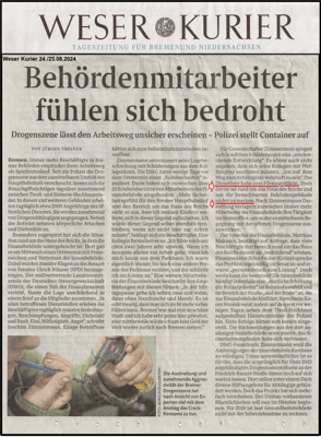 Die Zeitungen das Fernsehen die Behörden und die Polizei Bremen haben mein folgendes Schreiben vom 29.08.2024 erhalten und sind über einen "Amoklauf" informiert. In der Wache ist der Polizeibeamte aufgesprungen hat die Schreibstube verlassen und erklärt, es ist ein Fall für das SEK und hat sich nicht einmal die Zeit genommen, mir die Tagebuchnummer meiner Anzeige zu nennen. Der Name ist mit dem Eingangsstempel dokumentiert.