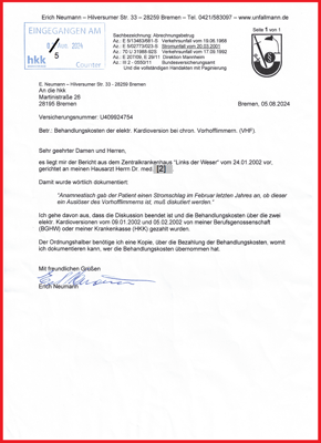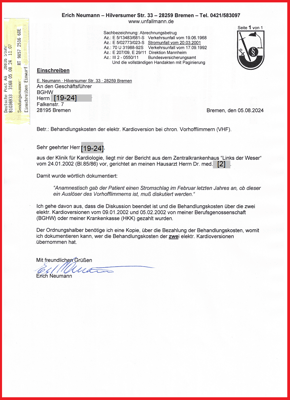 Die Ermittlungen zum Abrechnungsbetrug laufen auf vollen Touren und ich benötige ein Schrittmachersystem. Am 05.08.2024 kam es bei meinem Kardiologen [2-14] zum Besprechungstermin. Dabei habe ich erkannt, dem unrichtigen Gerichtsgutachten (03.05.2005) von Dr. med. [11-7] wurde weiterhin gefolgt und nicht erkennen konnte, bis zum Unfalltag war mein Herz frei von Vorhofflimmern, weil ihm das Gericht nicht den Vorbefund vom 06.02.2001 erkennbar gemacht hat. Wenn der Direktor am SG Bremen [19-14] und die BGHW nicht bekannt macht, dass das Gerichtsgutachten aktenkundig nicht mehr verwertbar ist. Dann wird Abrechnungsbetrug & Prozessdelikt aufrechterhalten. Insoweit liegt das Schreiben der Datenschutzbeauftragten Bremen vom 10.03.2020 vor und dokumentiert, die Gerichtsakte ist nicht mehr auffindbar und somit konnte das Gerichtsgutachten (03.05.2005) bis dato nicht vernichtet werden. Und wer wird nun die Kosten für das Schrittmachersystem übernehmen?