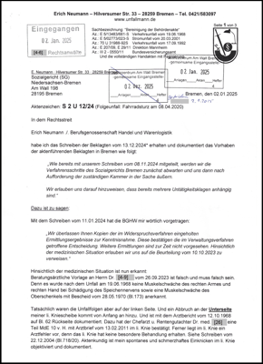 geschah am 19.06.1968 um Mitternacht. Als Fahrer der Firma E.H.Harms Automobil - Transporte kam mir ein alkoholisierter LKW Fahrer in die Quere, mein Beifahrer stirbt, ich überlebe, mit vielen Verletzungen. Firma E.H.Harms wurde 2009 von der Bremer Lagerhaus-Gesellschaft (BLG) übernommen. Eine Unterstützung im Kampf um Unfallrente habe ich von der BLG leider nicht erhalten. So musste ich als Schwerbehinderter vor dem Sozialgericht (SG) Bremen um mein Recht kämpfen und von der Beklagten mit Schriftsätzen vom 24.06.2013 zum "Nebenkriegsschauplatz" ernannt wurde. Sogleich hat die Beklagte vom Gericht gewünscht, mir soll Verhandlungsunfähigkeit bescheinigt werden. Und bei den mündlichen Verhandlungen vor dem LSG Bremen waren am 03.07.2012 und 19.07.2023 Justizbeamten anwesend, wie bei einem Strafprozess.
