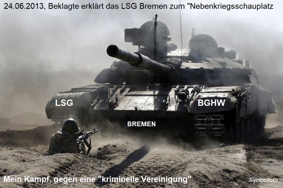 Das mächtige Syndikat hat mit Schriftsatz vom 24.06.2013 das LSG Bremen zum "Nebenkriegsschauplatz erklärt. Dazu wurde angeregt, mir soll auf dem "Kriegsschauplatz" "Verhandlungsunfähigkeit" bescheinigt werden.