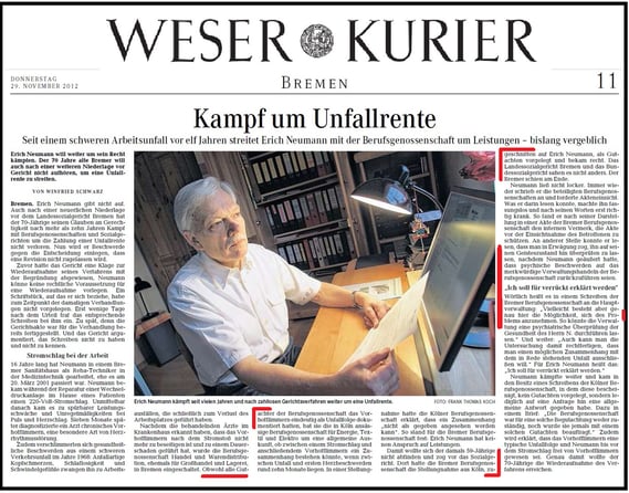 Ich bin 82 Jahre alt, schwerbehindert, liege seit 23 Jahren im Streit mit der BGHW um Unfallrente u. die BGHW hat eine merkwürdige Amtskultur: Compliance & Governance. Dazu im Einklang liegt mir die interne Stellungnahme der BGHW Bremen vom 05.10.2009 (drei Seiten) in Kopie vor (E 207/09), die ich niemals erhalten sollte, aber mit dem Schreiben der Direktion Mannheim vom 27.05.2011 als Anlage in Kopie erhalten habe. Die Kripo-Bremen hat die interne Stellungnahme der BGHW Bremen vom 05.10.2009 (3 Seiten) gesichtet und kam zu dem Ergebnis: Ich kämpfe gegen eine "kriminelle Vereinigung" die niemals Zurückrudern wird und vom Gesetzgeber mit einer Freiheitsstrafe bedroht wird. Diese Wertung habe ich übernommen und ist keine üble Nachrede.