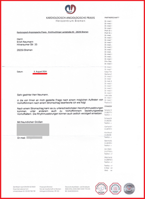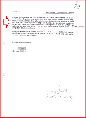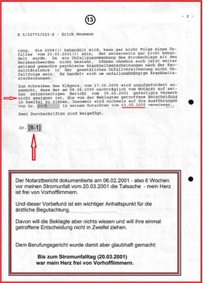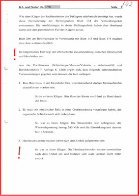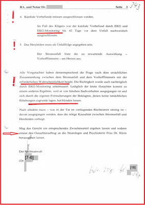 Dieser Befund ist von Bedeutung wenn - wie in meinem Fall - nach dem Stromunfall chronisches Vorhofflimmern diagnostiziert wird. Aber diesen ausschlaggebenden Notarztbericht hat das Gericht und die Beklagte (BGHW) keinem Sachverständigen und auch nicht dem Gerichtsgutachter offensichtlich gemacht.
