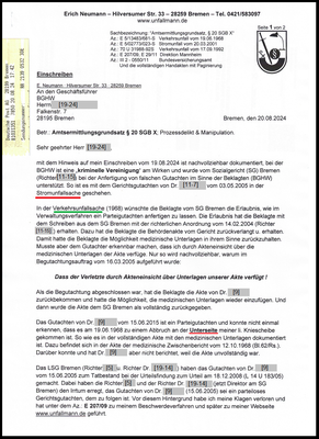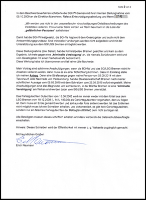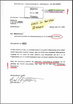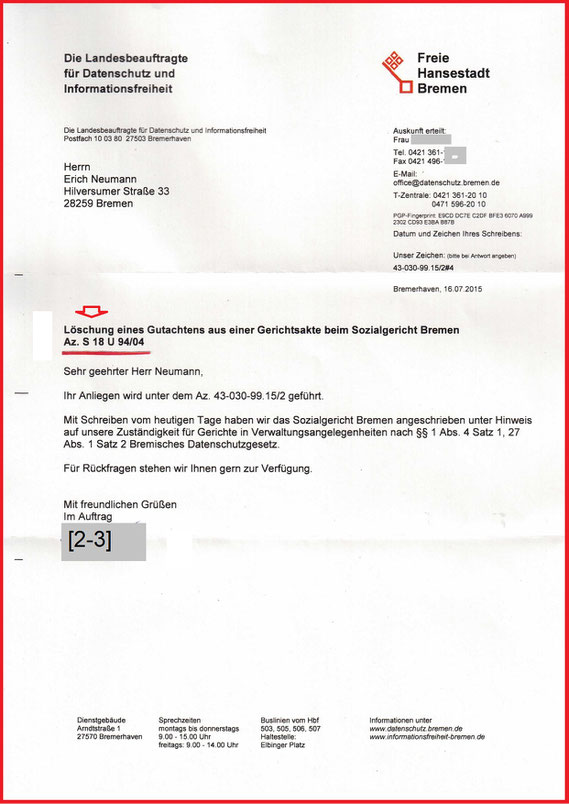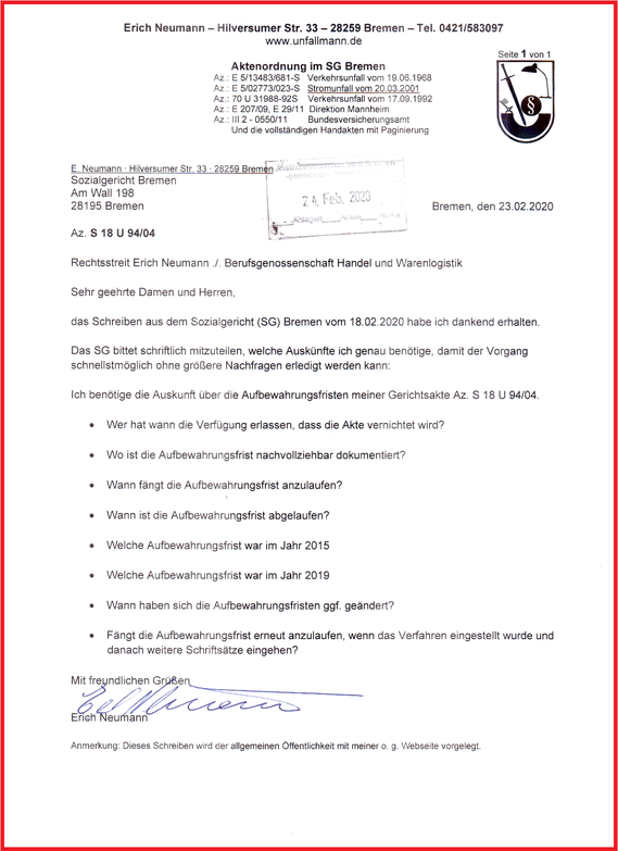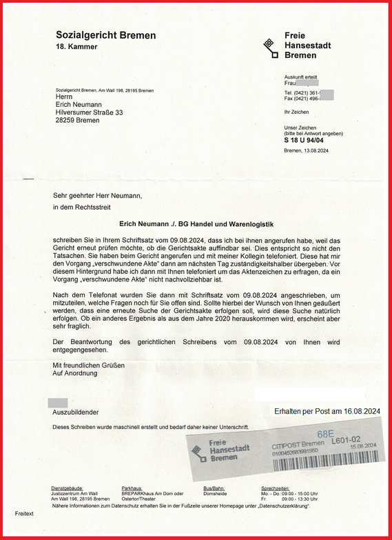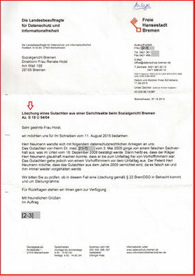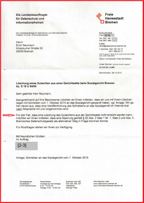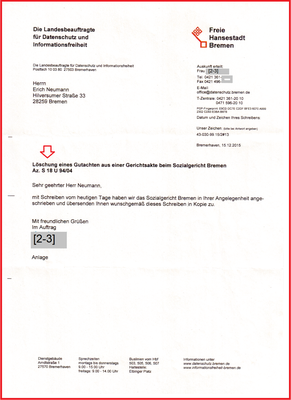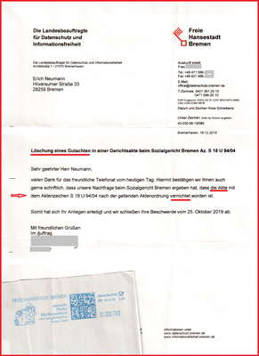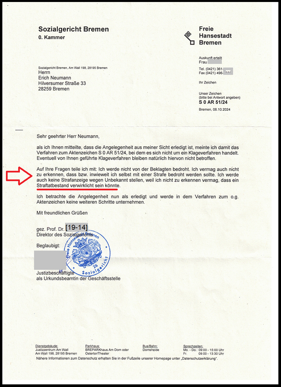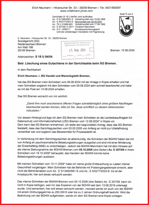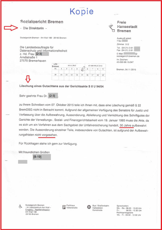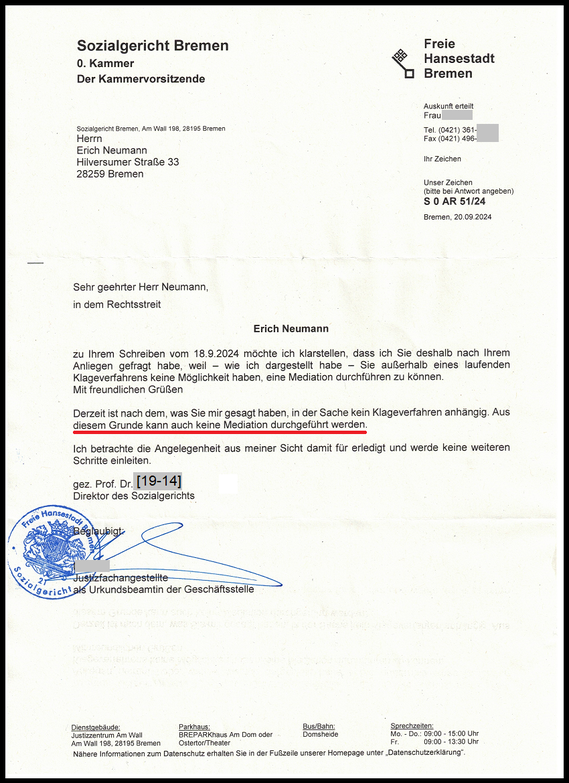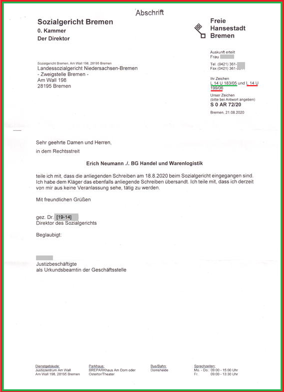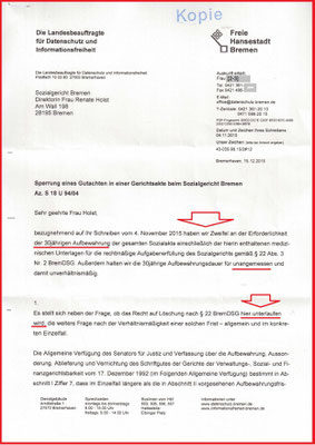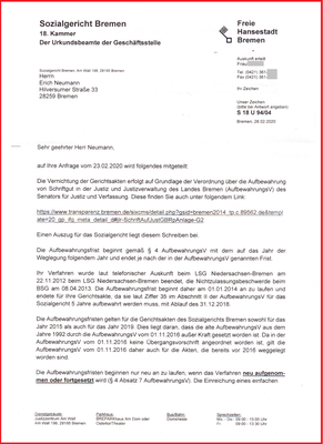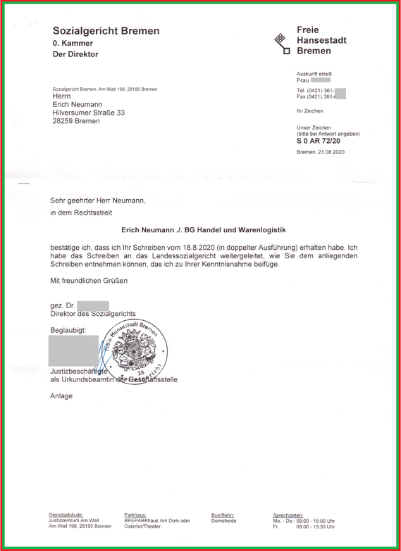 Antwortschreiben aus dem SG Bremen dokumentiert: