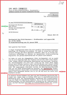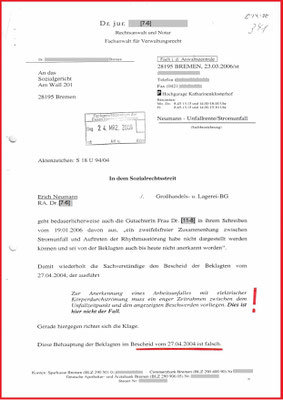 Das Gericht und die Beklagte folgen dem unrichtigen Gerichtsgutachten vom 03.05.2005, welches davon ausgeht mein Vorhofflimmern habe schon vor dem Stromunfall eingesetzt. Siehe Urteil LSG Bremen vom 18.12.2008.