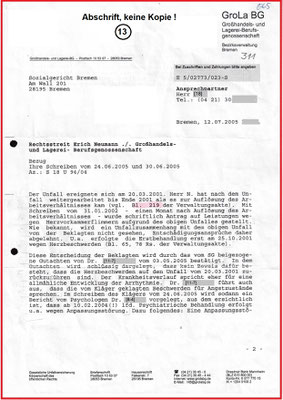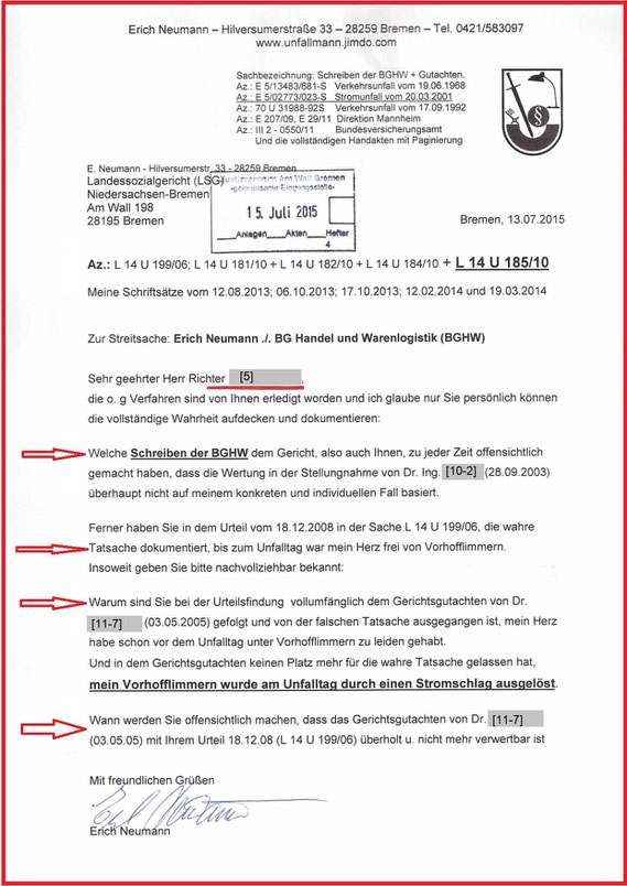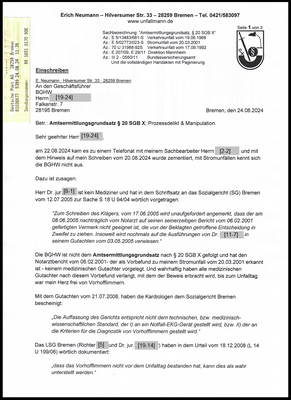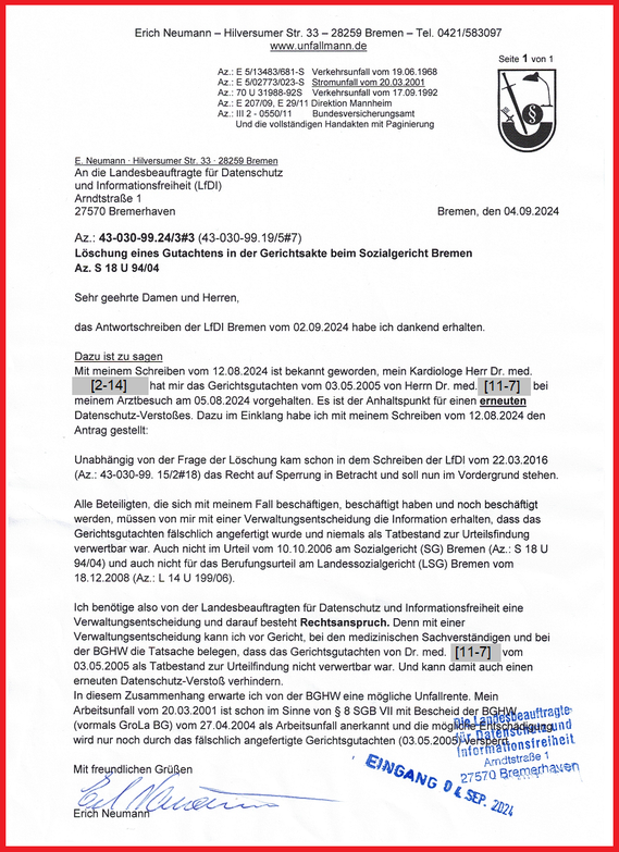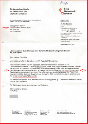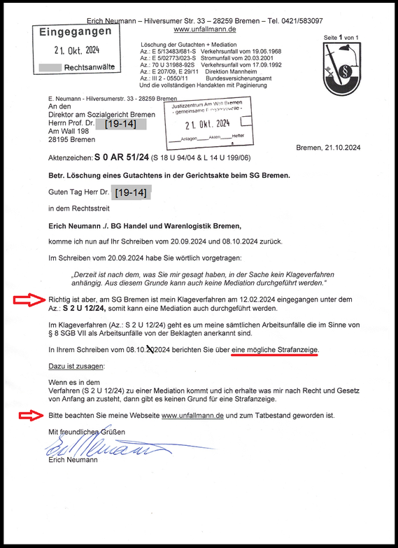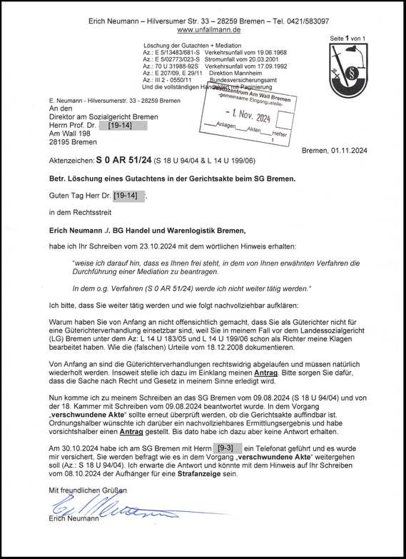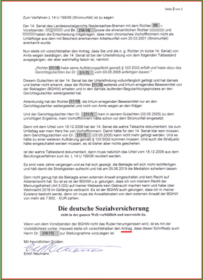 Vorab mein Schreiben an den Direktor am Sozialgericht (SG) Bremen und aktenkundig (L 14 U 199/06 & L 14 U 183/05) als Richter am Landessozialgericht (LSG) Bremen in Prozessdelikt verwickelt ist.