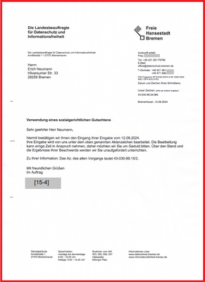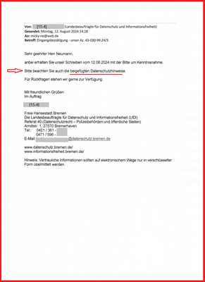Mein Schreiben (12.08.2024) habe ich der Datenschutzbeauftragten und Radio Bremen (Fernsehen) mit den Anlagen in Kopie übergeben.