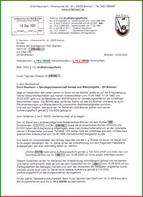 Richter Herr Dr. [19-14] ist nun der Direktor am Sozialgericht Bremen und darüber wurde in der Öffentlichkeit am 17.08.2016 berichtet. Und Herr Dr. [19-14] ist in Prozessdelikt verwickelt, den die Beklagte (BGHW) unglaublich und raffiniert mit krimineller Energie eingefädelt hat.