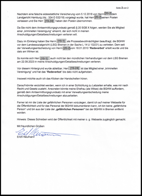 "Unterzeichner appelliert an die Vernunft. Die Aktenlage sei eindeutig und nicht anfechtbar und somit auch nicht angreifbar. Sämtliche Verfahren liefen rechtmäßig. Er müsse endlich einsehen, dass er so nicht weiterkommen könnte und ein Schlussstrich ziehen. Er müsse doch auch an seine Ehefrau denken, die er ebenfalls - ebenso wie sich selbst - stark psychisch und auch körperlich belasten würde. Er soll doch endlich sein Rentendasein genießen."