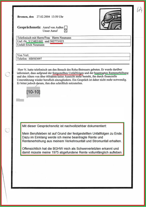 Mit der Gesprächsnotiz wird von der BGHW nachvollziehbar, mein Berufsleben ist aufgrund der festgestellten Unfallfolgen zu Ende.