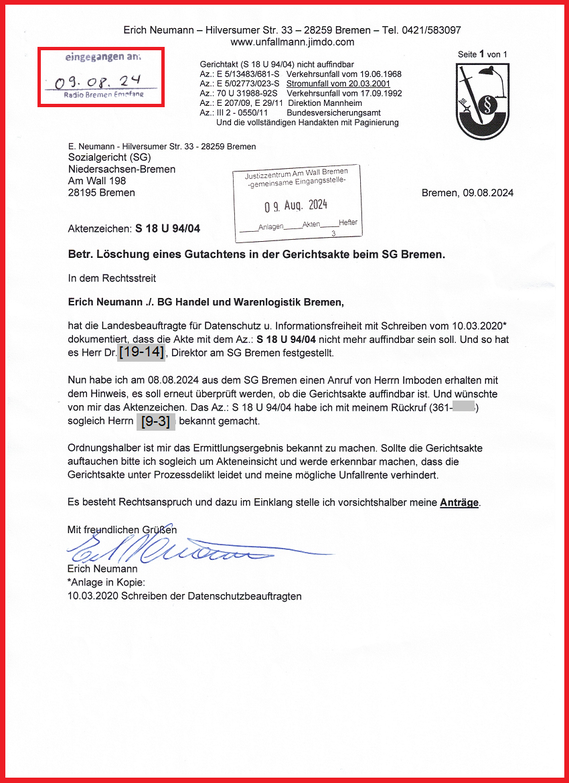 Dazu im Einklang liegen die o. g. Gutachten vor. Und in der Stromunfallsache liegen die Gutachten vom 15.11.2002 und 27.10.2003 vor. Diesen Gutachten hat das SG Bremen mit dem unrichtigen Gerichtsgutachten vom 03.05.2005 widersprochen. Und kann nicht aus der Akte entfernt werden, weil die Gerichtsakte seit dem 10.03.2020 nicht mehr auffindbar ist.