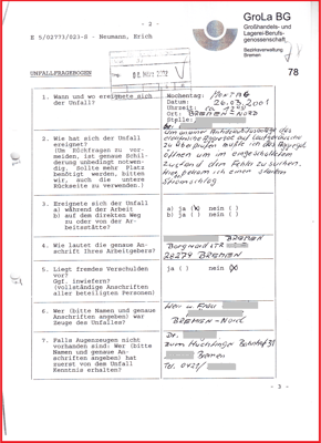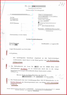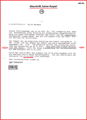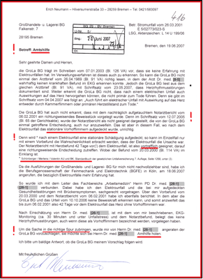 Im Rahmen der Gesetzmäßigkeit hat die BGHW meinen Stromunfall vom 20.03.2001 als Arbeitsunfall im Verwaltungsverfahren mit Bescheid vom 27.04.2004 anerkannt. Gesetzwidrig hat die BGHW keinen Gesundheitsschaden eingetragen. Obwohl dieser als chronisches Vorhofflimmern in allen medizinischen Gutachten der BGHW diagnostiziert und dokumentiert wurde. Der BGHW liegt auch ein Vorbefund mit dem Notarztbericht vom 06.02.2001 vor. Damit wurde Glaubhaft gemacht, bis zum Unfalltag (20.03.2001) war mein Herz frei von Vorhofflimmern.