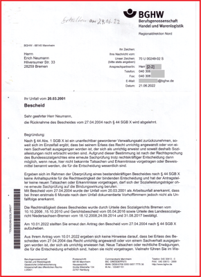 Widerspruchsbescheid der BGHW vom 21.09.2022. Mein Widerspruch wurde zurückgewiesen.