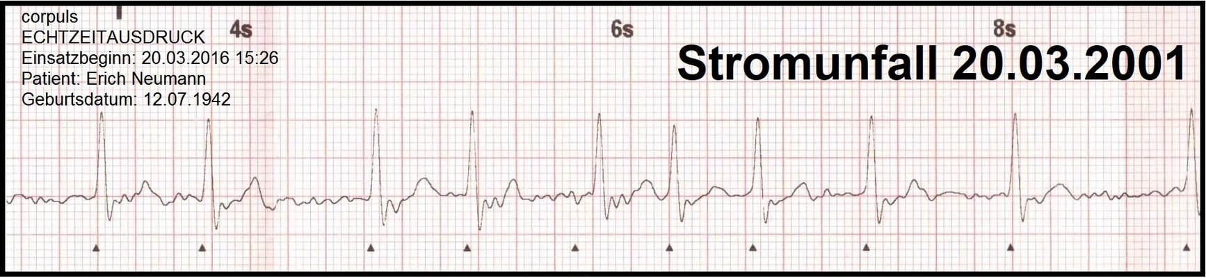 Am 06.02.2001 kam es im Med. Techn. Notdienst zu meinem Verkehrsunfall, ohne Dauerschaden. Notarztbericht (06.02.2001) & Gutachten (21.07.2008) haben den Beweis erbracht, bis zum Stromunfall (20.03.2001) war mein Herz ohne Vorhofflimmern.