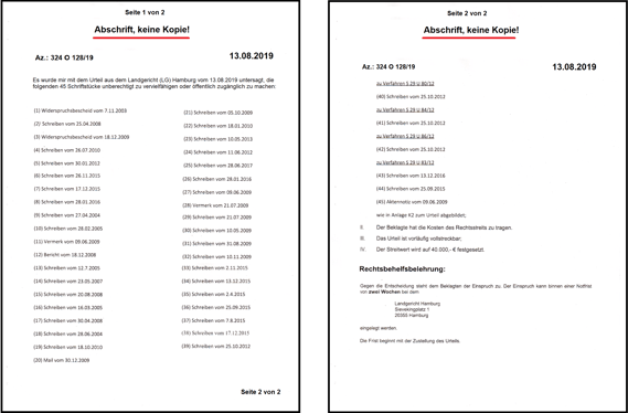 Die Beklagte hat 45 Schriftstücke zur Geheimhaltung durch das Landgericht (LG) Hamburg am 13.08.2019 festgesetzt.