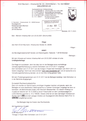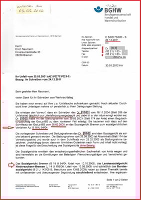 Dieses ist der damalige Geschäftsführer der BGHW Bremen und hat mit seinem Antwortschreiben vom 30.01.2012 die Unwahrheit behauptet, das falsche Beweismittel sei nicht zur Urteilsfindung verwertet worden. Und ist sogleich mit dem ausgefertigtem Urteil vom 18.12.2008 widersprochen.