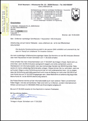 Dieses Schreiben vom 05.10.2009 (drei Seiten) hat die Staatsanwaltschaft (STA) Bremen am 22.11.2012 sofort zu einem Ermittlungsverfahren mit dem Tatvorwurf üble Nachrede veranlasst. Jedoch hat die STA Bremen die BGHW zu keiner sofortigen Vernehmung vorgeladen. So ist es mit dem Schreiben der BGHW vom 22.05.2013 nachvollziehbar dokumentiert.