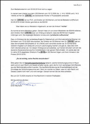Die Mediation war schon vom LG Hamburg mit Beschluss vom 21.05.2019 festgesetzt. Weil ich keinen Anwalt habe haben die Mediatoren die Mediation (Schlichtung) verweigert und wurde mit der E-Mail aus dem LG Hamburg vom 11.07.2019 bekannt gemacht.