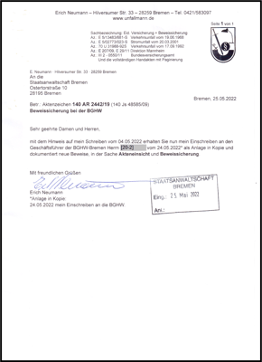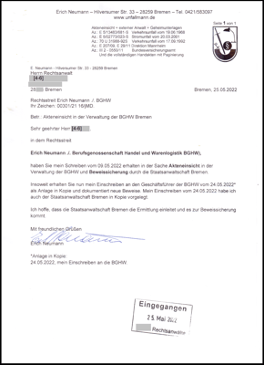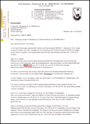 Danach hat die BGHW einen externen Anwalt eingeschaltet und kein Recht auf Akteneinsicht hat. Auf Grund einer Verfügung vom 29.11.2018 hat dieser Anwalt die eid. Versicherung von dem Geschäftsführer der BGHW Bremen vom 30.11.2018 dem LG Hamburg vorgelegt.