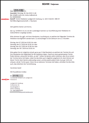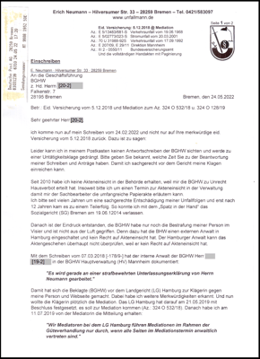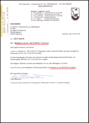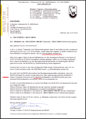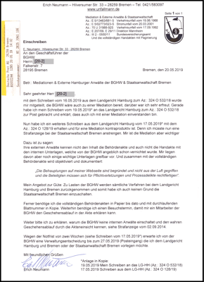Jedoch habe ich Merkwürdigkeiten erkannt (Verfügung vom 29.11.2018 u. eid. Versicherung vom 5.12.2018) die sich durch meine Akteneinsicht am 22.03.2019 bestätigt haben. Und plötzlich wollte die Klägerin (BGHW) am 13.05.2019 die Mediation und ich habe mit meinem Schreiben vom 19.05.2019 zugestimmt. Darauf wurde mit Beschluss aus dem LG Hamburg vom 21.05.2019 die Mediation gemäß den §§ 278 Abs. 5 ZPO festgesetzt.