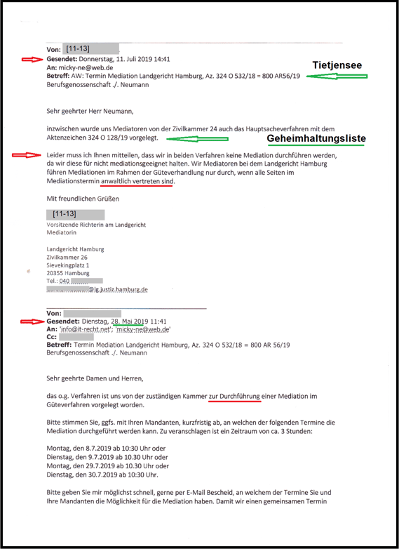 Es wurde erkannt, das Landgericht (LG) Hamburg hat scheinbar eine unrichtige Mediationsordnung angewandt und hat mit der E-Mail vom 11.Juli 2019 den Beschluss aus dem LG Hamburg vom 21.05.2019 aufgehoben und damit auch die Mediation in der Sache 324 O 532/18 (Tietjensee) und in der Sache 324 O 128/19 (Geheimhaltungsliste über 45 Akten und Verwaltungsentscheidungen der BGHW).