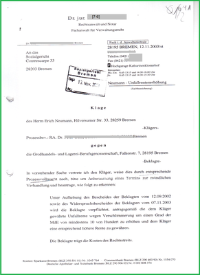 Mit meinem Schreiben vom 14.10.2003 wurde nachvollziehbar dokumentiert, die BGHW (vormals GroLa BG) folgt nicht dem Gesetzgeber gemäß § 20 SGB X und dem Untersuchungsgrundsatz. Und zerrt die Sache vor das SG Bremen.