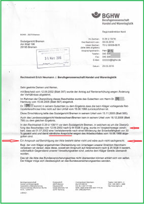 Die BGHW entfernt keine nachteiligen Unterlagen aus der Akte. Und behauptet durchgehend und aktenkundig alles überprüft zu haben und es wären keine Fehler vorhanden. Auch das Schreiben vom 26.07.2010 (Bl.844/5) zum Az.: E 207/09 hat die BGHW aus meiner Unfallakte zu entfernen, denn zu meinem Nachteil wird vorgespiegelt, es gab und gibt keine Fehler.