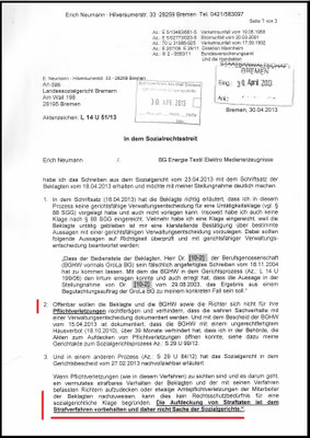 So hat es die Direktorin am SG Bremen der Öffentlichkeit bekannt gemacht und meinen Fall am 29.12.2010 persönlich bearbeitet hat. Dass ich mein Recht am SG aber nicht einfordern soll, ist nur erklärbar wenn dabei das SG Bremen an Ansehen verliert.