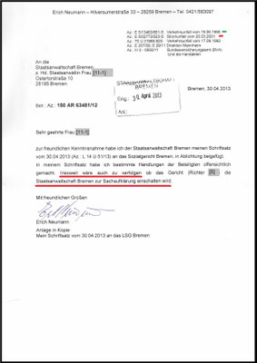 Mein Schreiben an die Staatsanwaltschaft Bremen