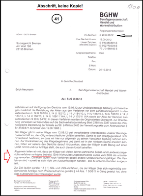 Die BGHW hat es aber niemals dazu kommen lassen. Wenn die Überprüfung restlos und widerspruchslos abgelaufen ist, kann ich meine Klagen vor dem SG Bremen mit dem Az. S 2 U 9/23 und 14/23 sachgerecht begründen. Und nur so hätte das SG Bremen zur Urteilsfindung auch den wahren Tatbestand vorliegen.