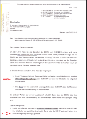 "dass nur die Einleitung eines Strafverfahrens wegen übler Nachrede verhindern könne, dass Herr Neumann weiterhin die Mitarbeiter der Berufsgenossenschaft als Betrüger bezeichnet."