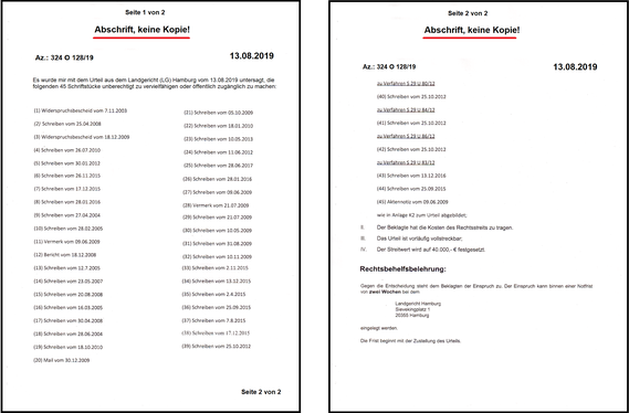 Quasi wie im NSA Prozess hält das Landgericht (LG) Hamburg 45 Akten und Verwaltungsentscheidungen der BGHW aus meiner Akte unter Verschluss. Dazu liegt mir die Liste und der Beschluss aus dem LG Hamburg vom 13.08.2019 vor (Az.: 324 O 128/19). Die Geheimhaltung führt dazu, dass ich mein Recht vor dem Sozialgericht Bremen nicht mehr einklagen kann, weil die Beweismittel unter Verschluss liegen. Ich muss der Geheimhaltung folgen, denn ich werde von der BGHW mit einem Ordnungsgeld bis zu 250.000,-€ bedroht oder einer Freiheitsstrafe bis zu 2 Jahren. Auch das Kopieren ist untersagt. Wann die Sperrfrist abläuft ist unbekannt.