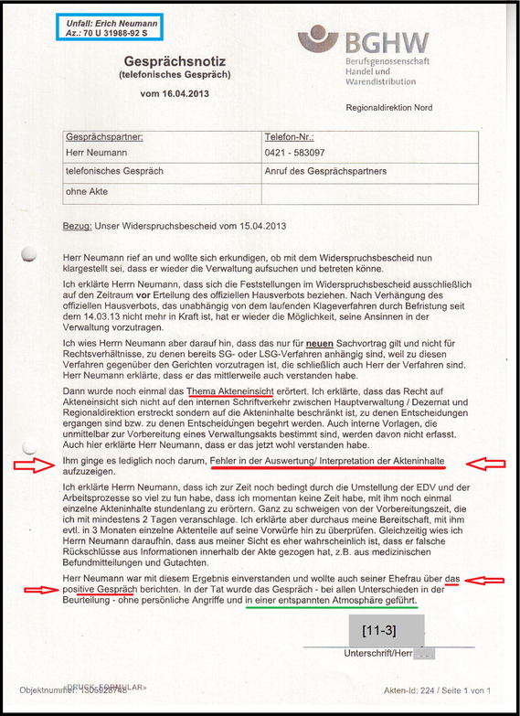 Mit der Gesprächsnotiz wurde schon am 16.04.2013 dokumentiert. Die BGHW erklärte sich bereit meine Vorwürfe mit mir zusammen und in der Verwaltung zu überprüfen.