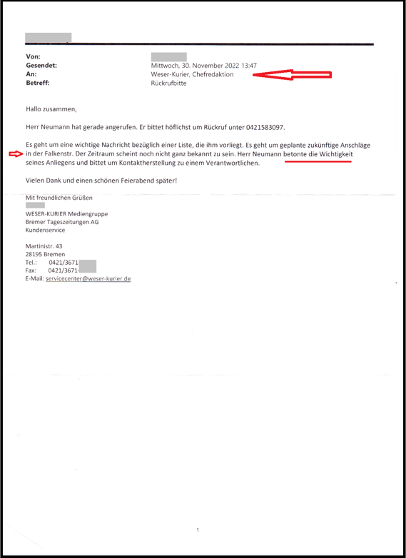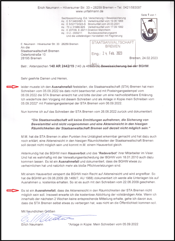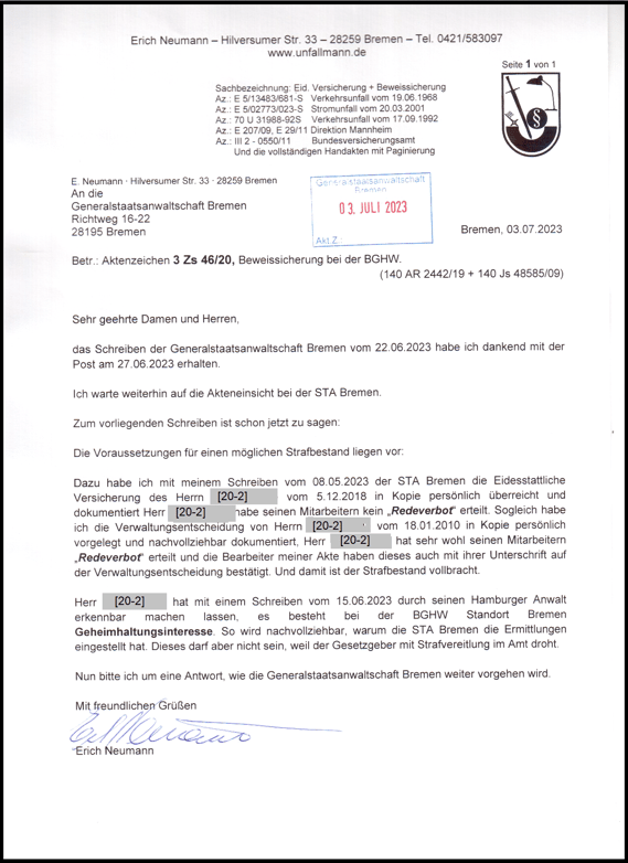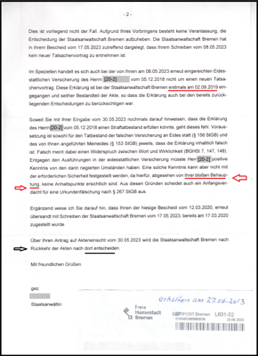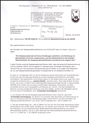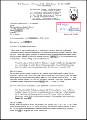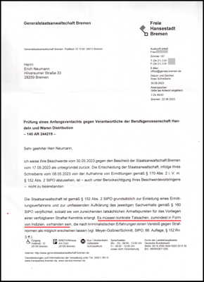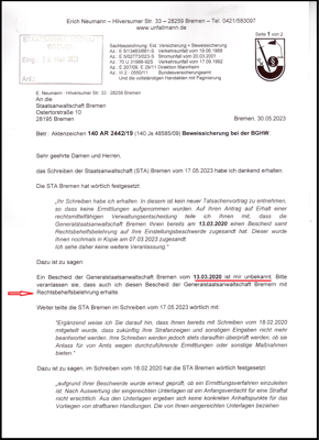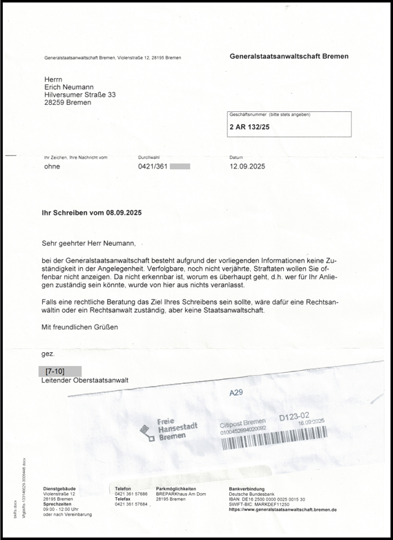 Mein Antwortschreiben hat die Generalstaatsanwaltschaft Bremen erhalten