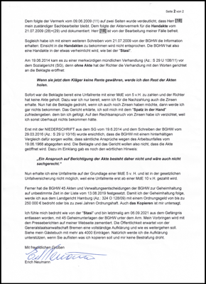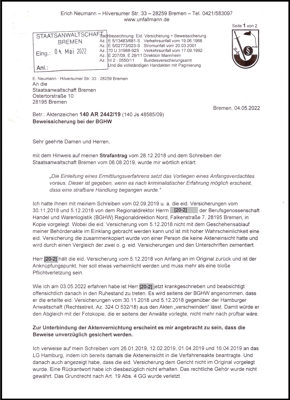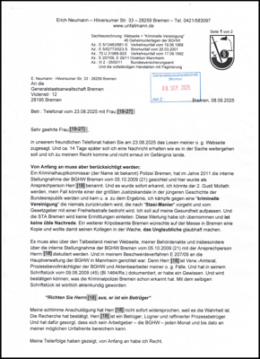 An dieser Stelle muss der Leser erfahren, die Kriminalpolizei Bremen hat im Jahre 2012 die interne Stellungnahme der BGHW Bremen in meiner Beschwerdeangelegenheit (E 207/09) vom 05.10.2009 gesichtet und kam u. a. zu dem Ergebnis, ich kämpfe gegen eine "kriminelle Vereinigung" die niemals zurückrudern wird, die nach "Stasi-Manier" vorgeht und vom Gesetzgeber mit einer Freiheitsstrafe bedroht wird. Ich soll auf meine Gesundheit aufpassen. Die Staatsanwaltschaft (STA) Bremen wird keine Ermittlungen einleiten. Und ich könnte der 2. Gustl Mollath werden. Diese Wertungen habe ich übernommen, sind keine üblen Nachrede und sind auch eingetroffen.